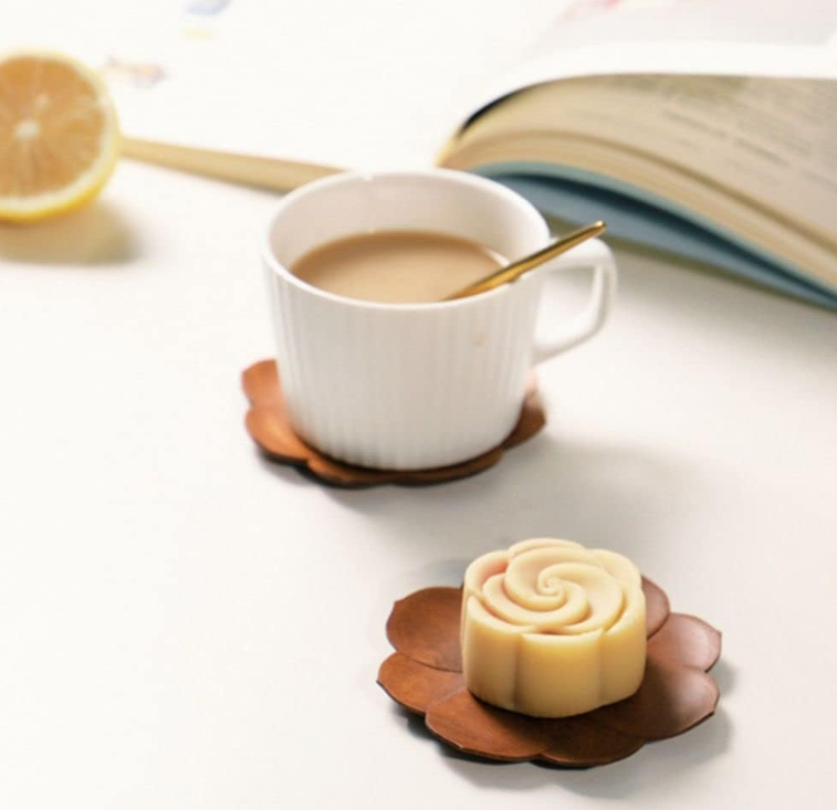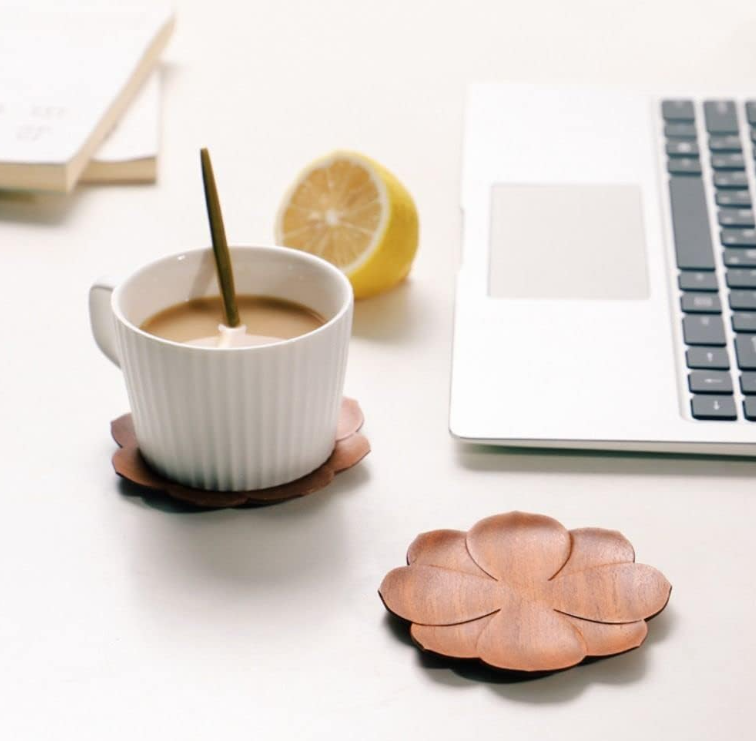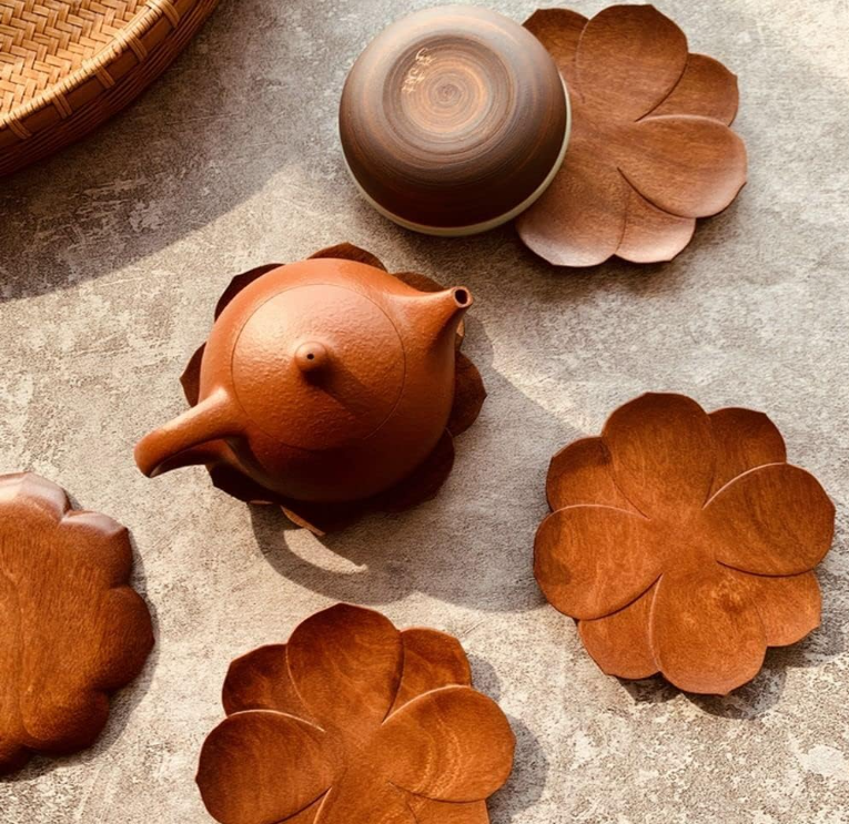 Handcrafted wooden coaster in six petal flower shape natural wood drink mat for cups mugs and home table decoration from Vietnam