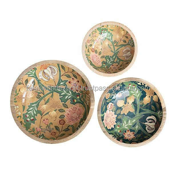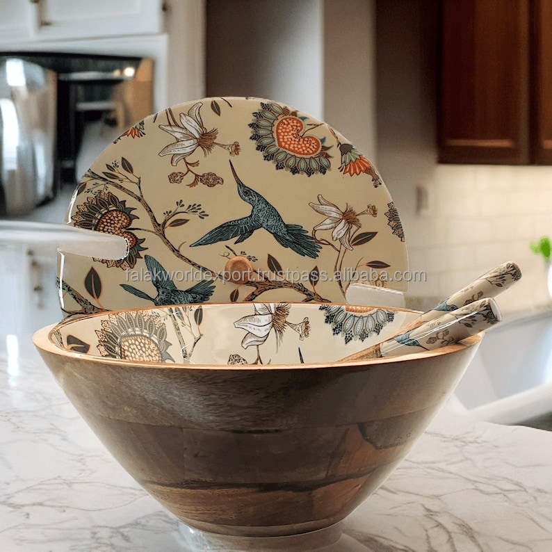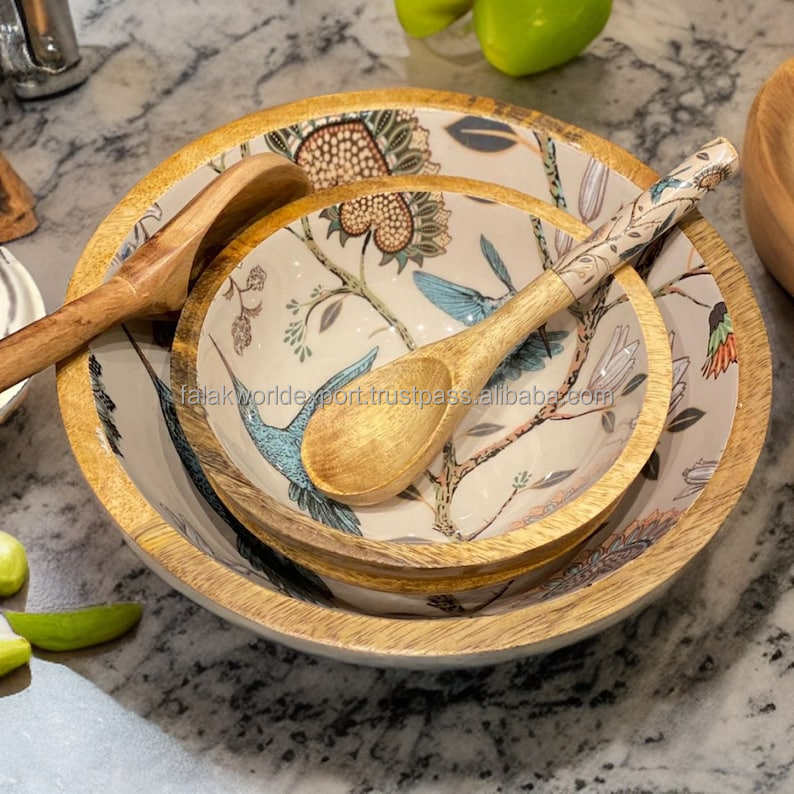 Handcrafted wooden serving bowl with serving spoon multi Colour enameled design hot selling for serving fruits in home & party