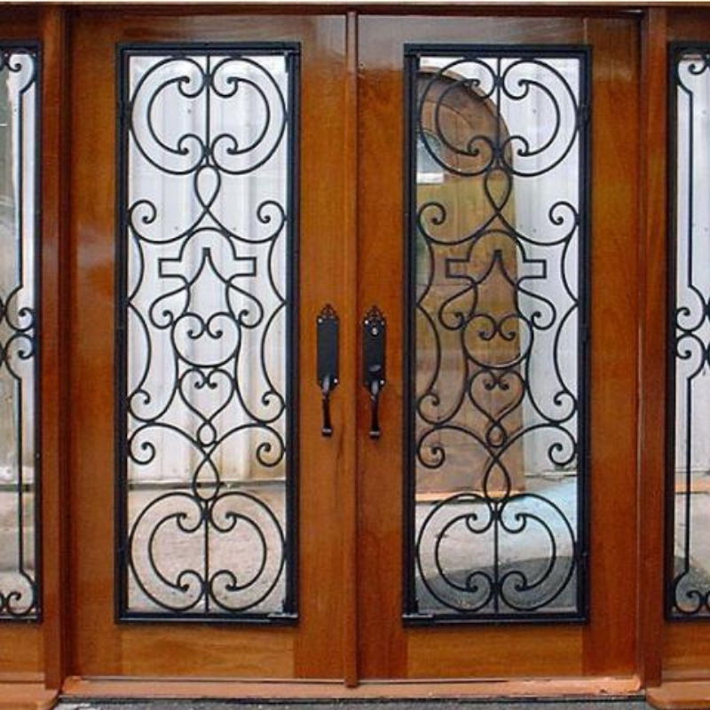 Handcrafted wrought iron door for villa entrance with matching metal windows and decorative ironwork