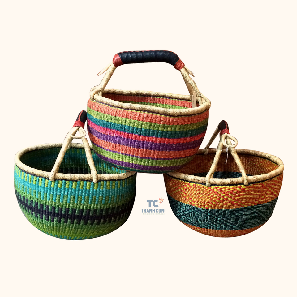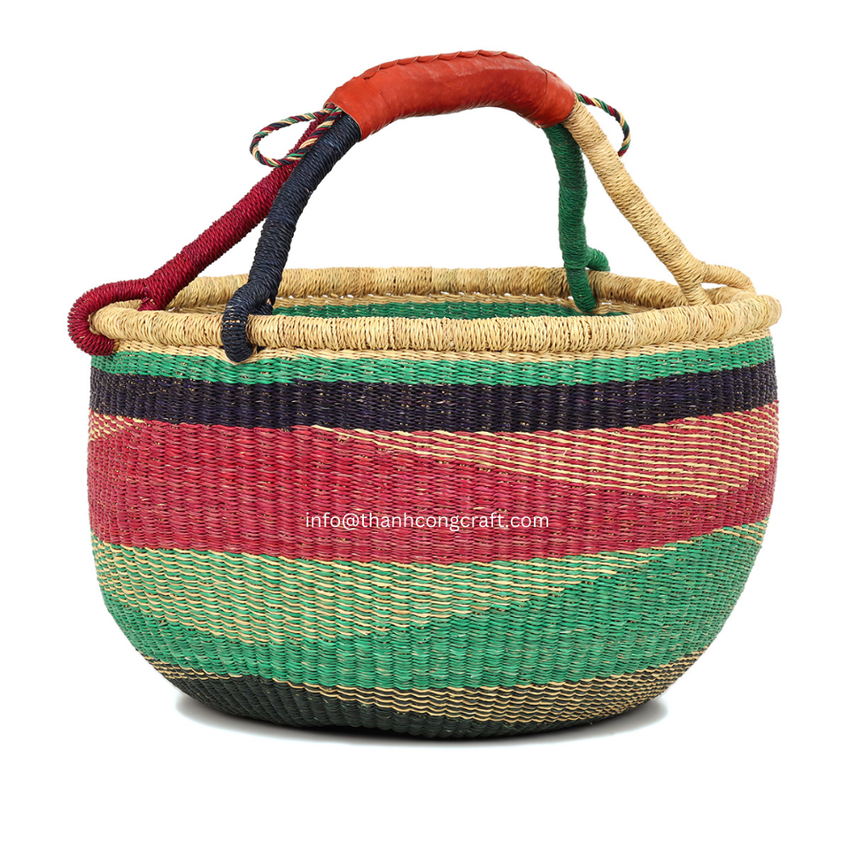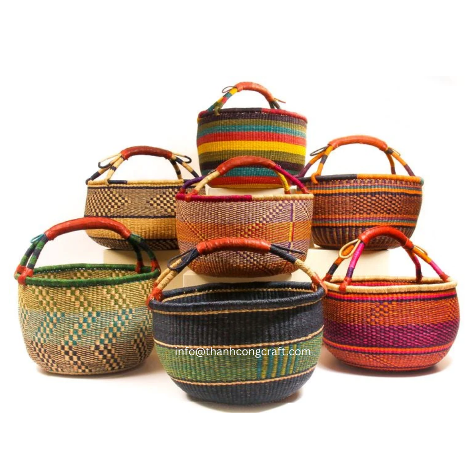 Handicrafts Ecofriendly Vietnam Seagrass Bolga Basket with Handle Handmade Round Seagrass Colorful Woven Baskets Carry Bags