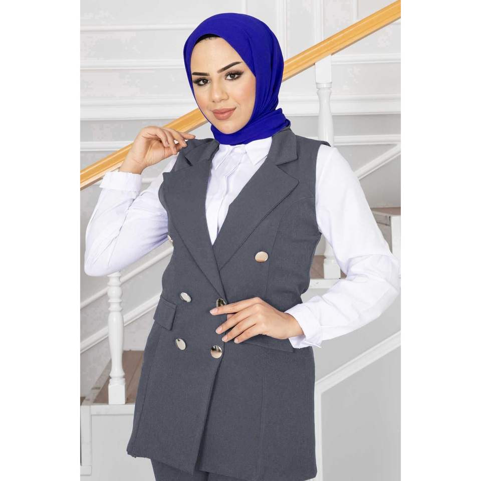 Handkerchief Collar Detailed Hijab Vest 2 Piece Set Gray