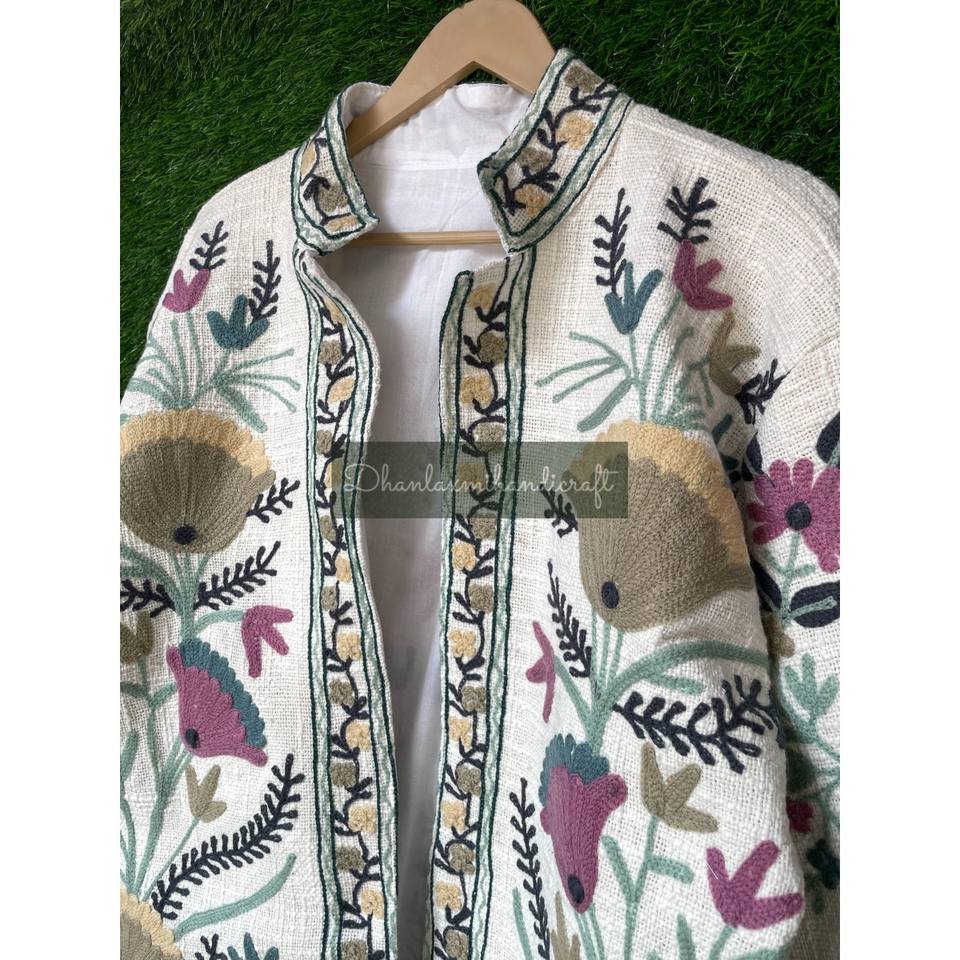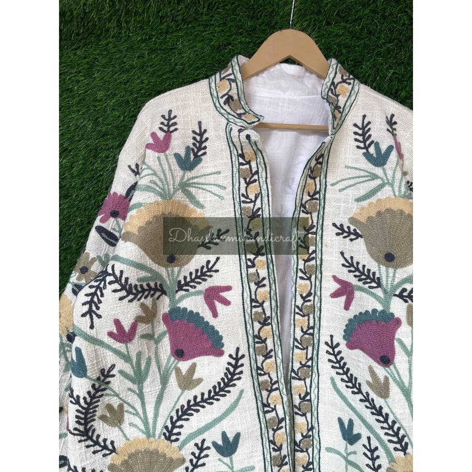 Unisex Handloom Cotton Winter Jacket Floral Embroidery Knitted Suzani Floral Design Indian Textile Party Wear Short Overcoat
