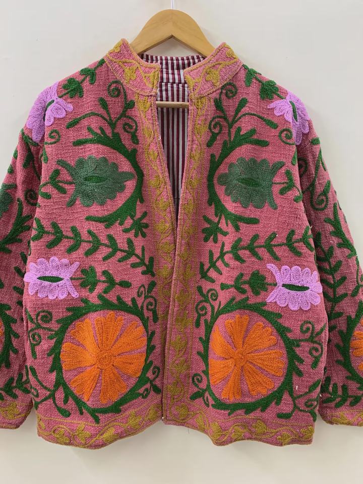 Handmade 100% Cotton Boho Jacket Indian Embroidered Suzani Coat with Floral Pattern Quilted Embroidery Jacket