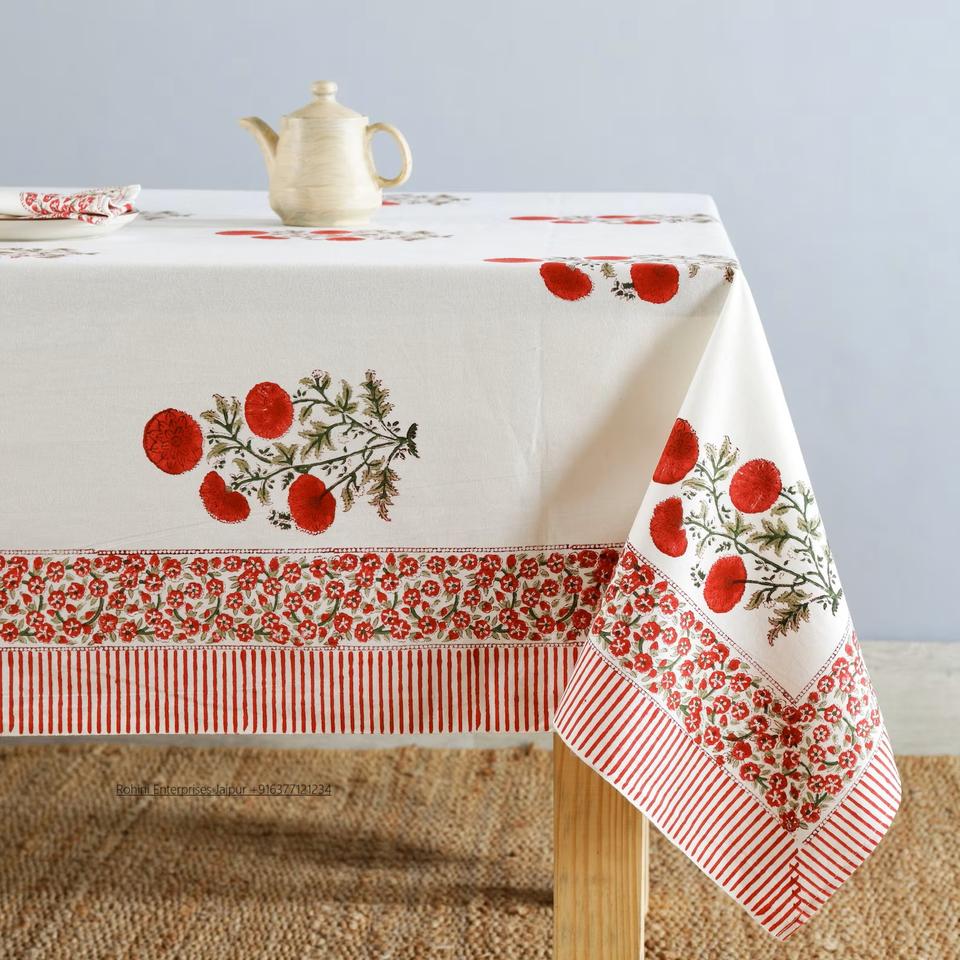 Handmade 100% Cotton Tablecloth Cover Red Poppy Floral Indian Block Printed Custom Size Custom Logo Custom Packing Home Hotel