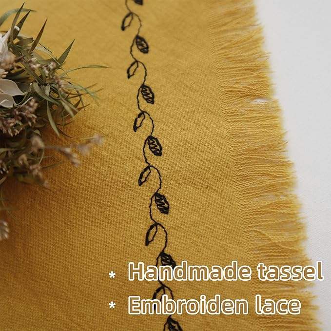 Handmade 100% Cotton Tablecloth With Embroidered Floral Pattern Self Fringes Mustard Fabric Cover for Indoor Outdoor Use Home