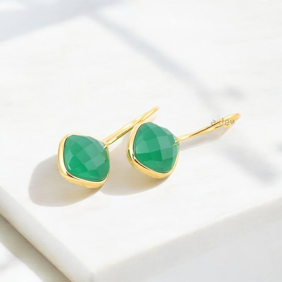 Handmade 18K Gold Plated Natural Green Onyx Hoop Earrings 925 Sterling Silver Statement Gemstone Jewelry for Women