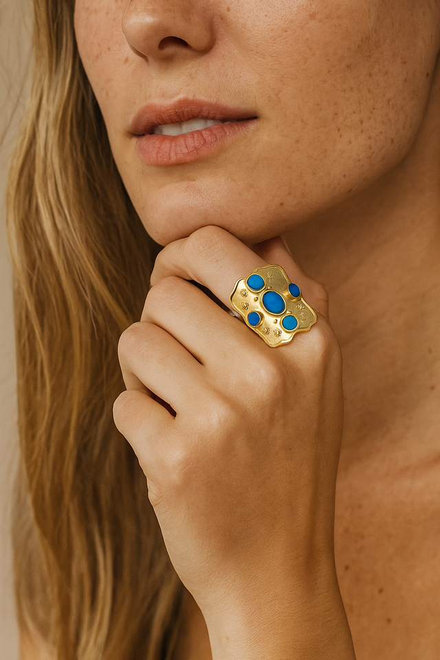 Handmade 18K Gold Plated Neon Blue Apatite Gemstone Adjustable Shield Ring Trendy Boho Statement Jewelry for Women for Weddings