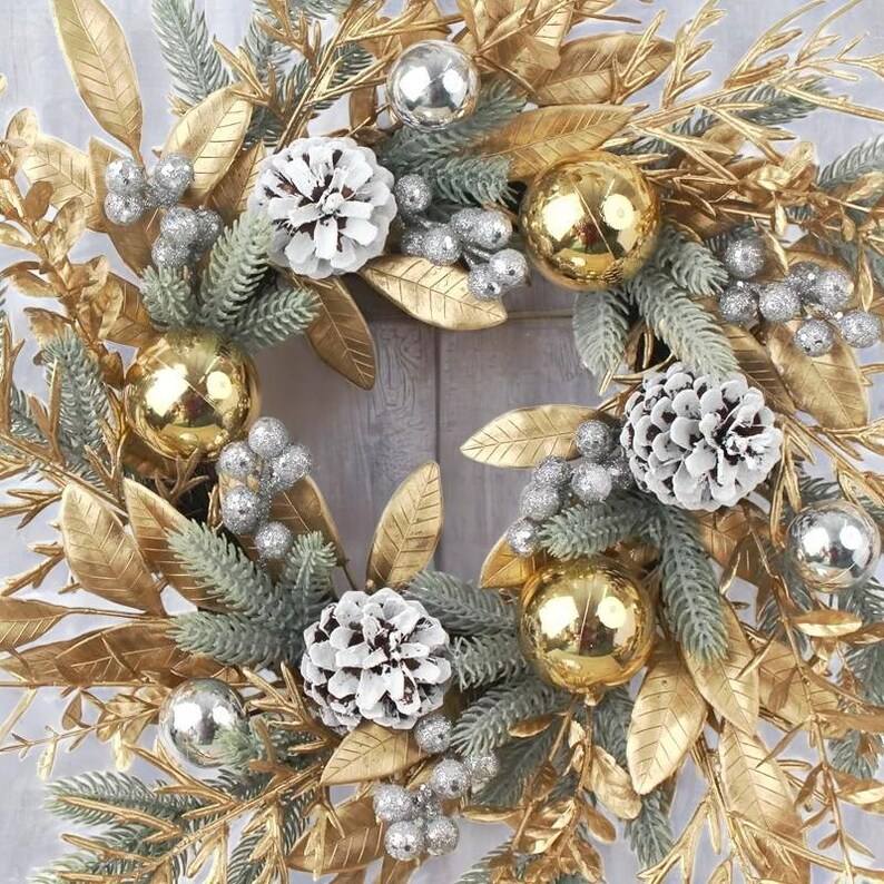 Handmade 50cm Gold Silver Elegance Christmas Wreath Decorative Holiday Door and Wall Hanging Wreath for Home Front Door