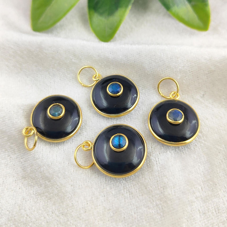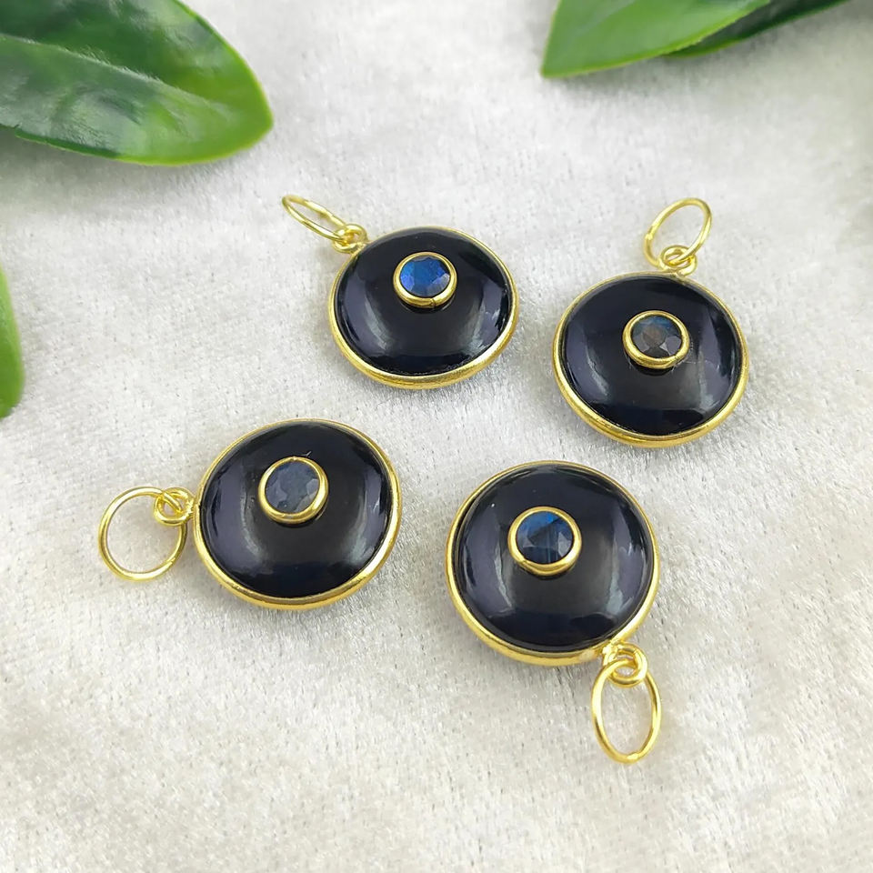 Handmade 925 Silver Bezel Setting Pendant with Double Onyx and Labradorite Gold Vermeil Black Coin Charms 925 Silver Jewelry