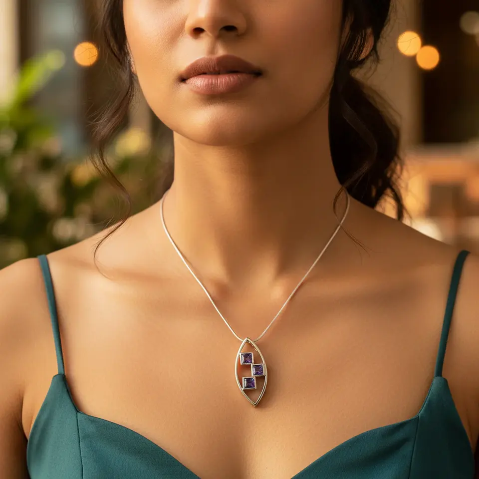 Handmade 925 Silver Pendant with Amethyst Gemstone Rose Gold and Emerald Cut Ruby Quartz for Women Charm Pendant Jewelry