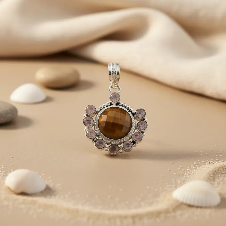 Handmade 925 Silver Tiger Eye Gemstone Pendant Cross Pattern Religious Gift for Women Featuring Diamond Amethyst Gold Jewelry