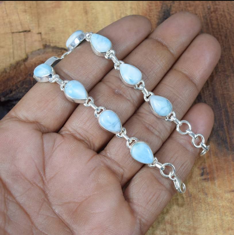 Handmade 925 Sterling Silver Bracelet Unisex Key Number Shaped Larimar Gemstone Jewelry Anniversary Gift Wife Husband Wedding