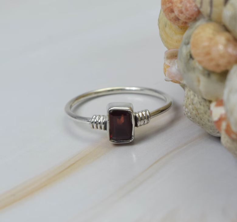 Handmade 925 Sterling Silver Gemstone Ring Trendy Red Garnet Rectangle Cut Tiny Garnet January Birthstone Gift for Her