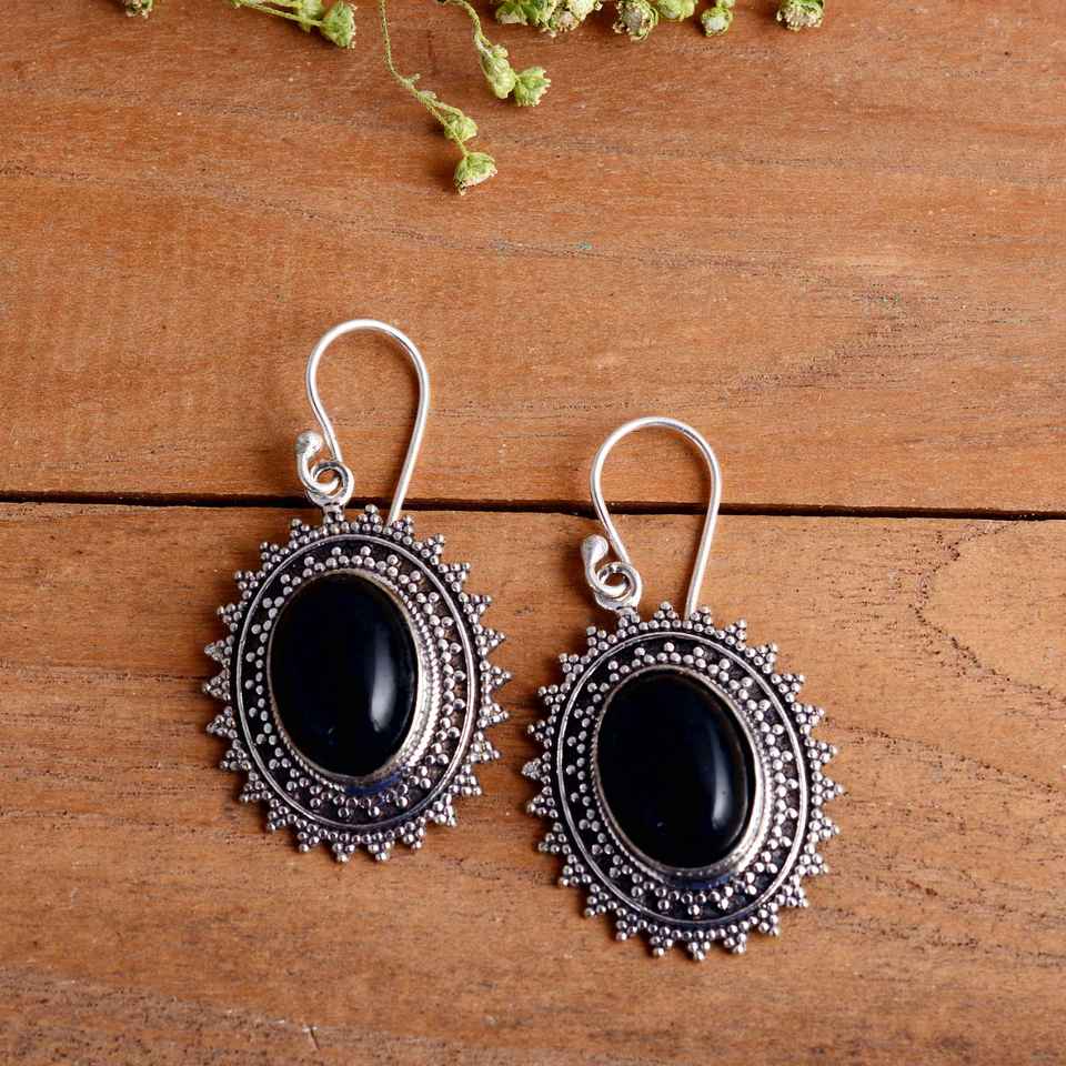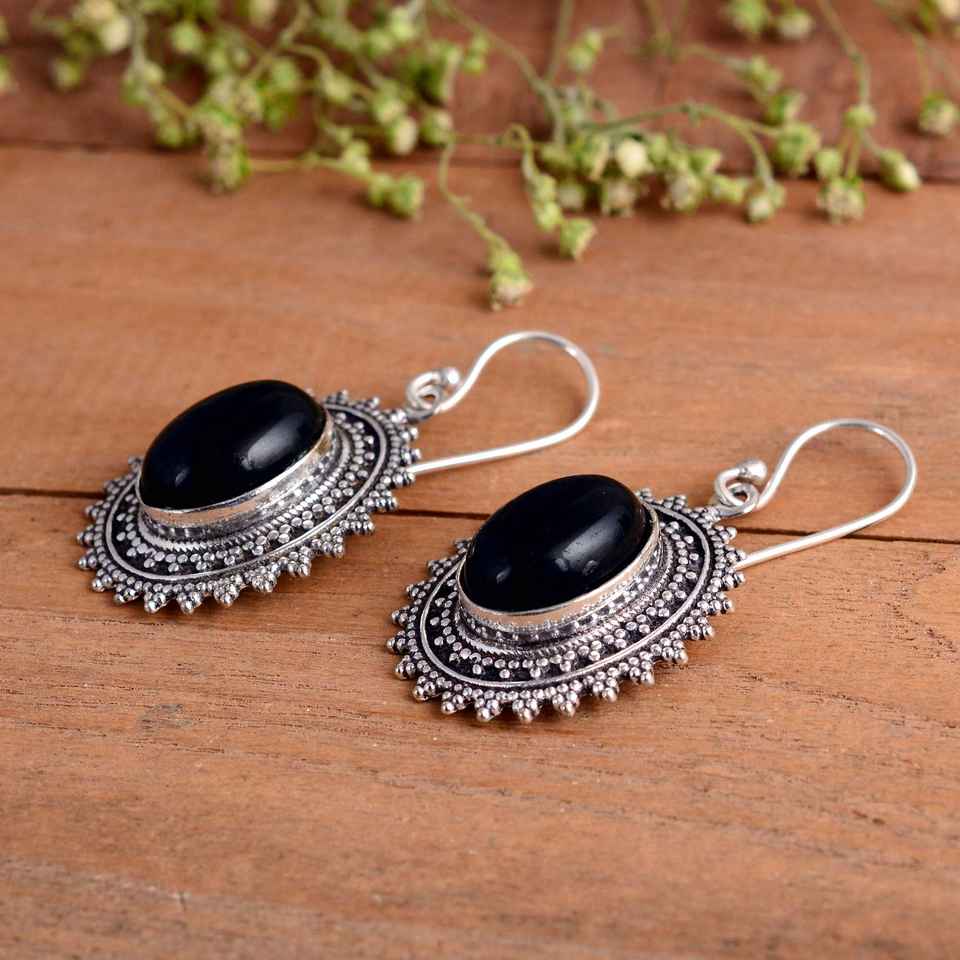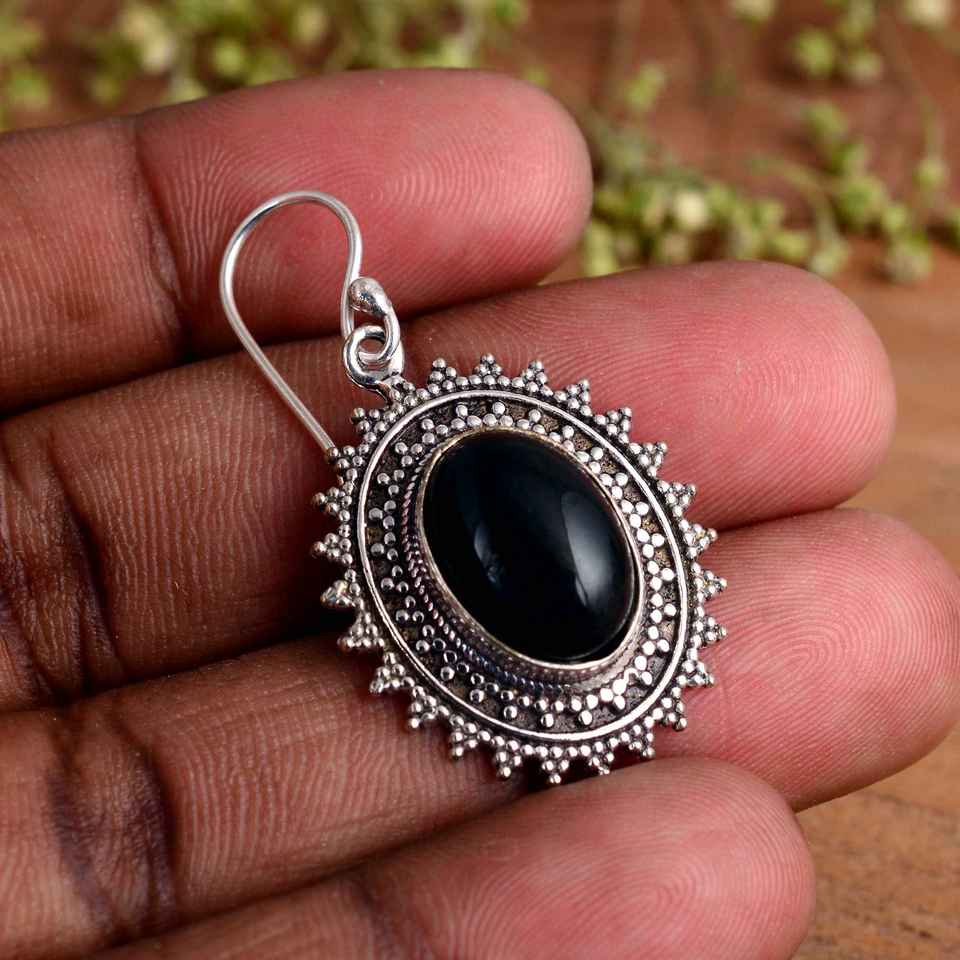 Handmade 925 Sterling Silver Gold Black Onyx Oval Dangle Earrings Vintage Oxidized Sunburst Design Party Gift Gemstone Jewelry