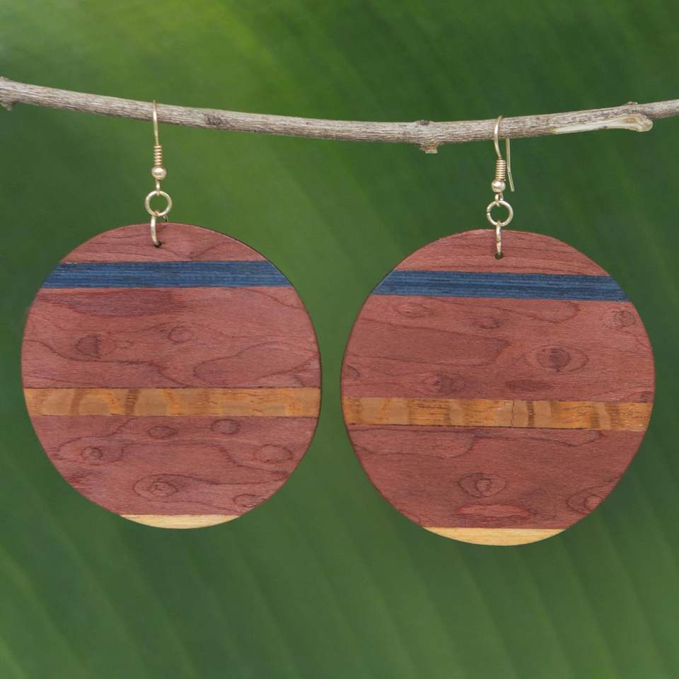 Handmade .925 Sterling Silver Wood Dangle Earrings Striped From Brazil 18k Gold Accent Brown Reclaimed [3.3 in H X 2.5 in Diam