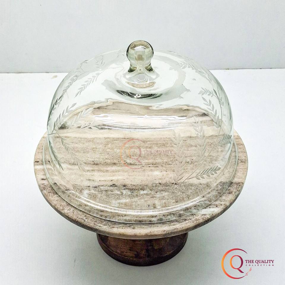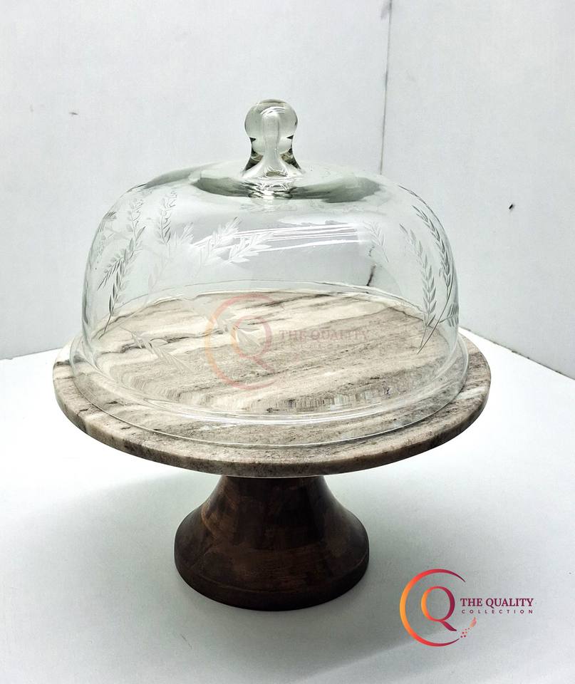 Handmade Acacia Wood Cake Stand with Customized Logo Print Marble Glass Dome for Christmas Display or Year-Round Use