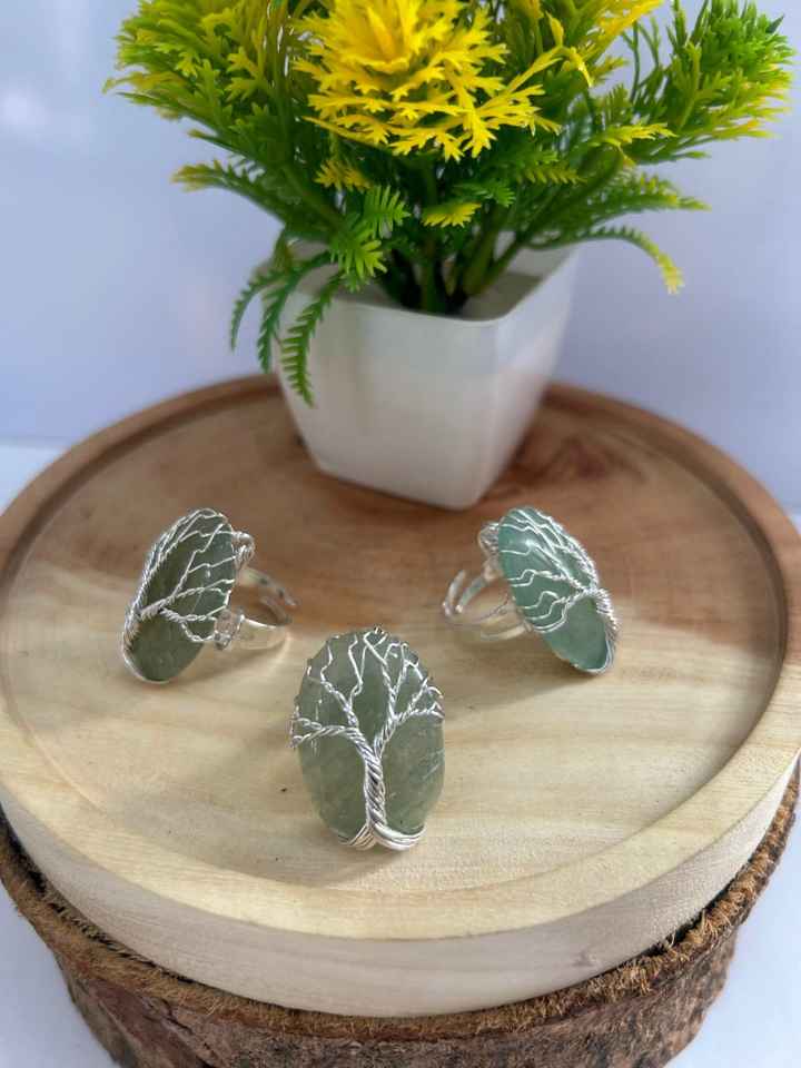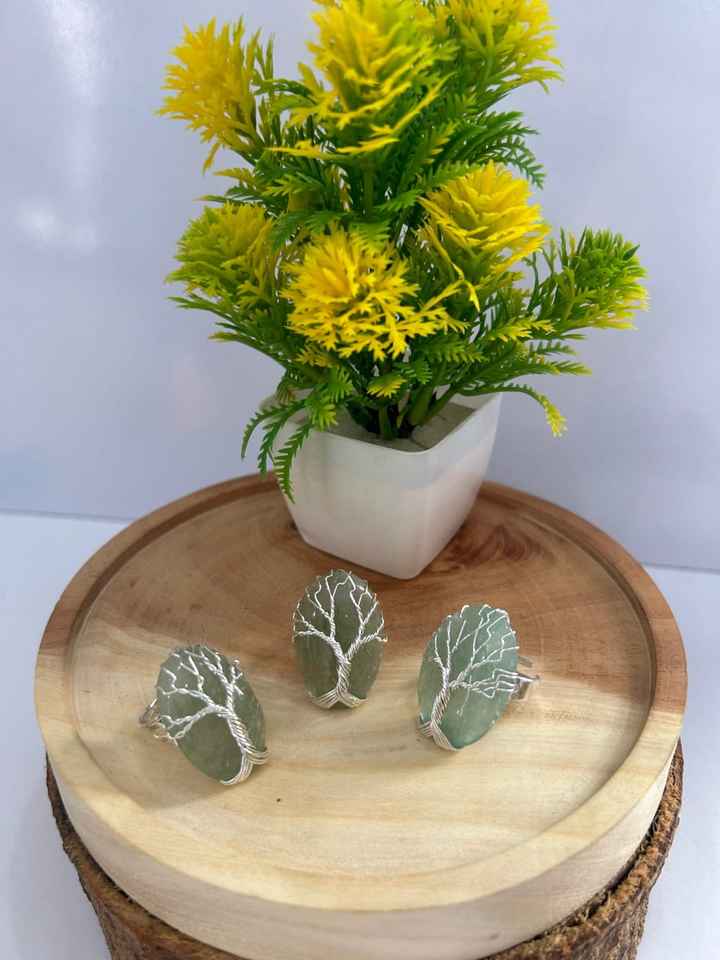 Handmade Adjustable Antique Silver Plated Green Aventurine Gemstone Ring Trendy Green Tree Life Design for Daily Energy Balance