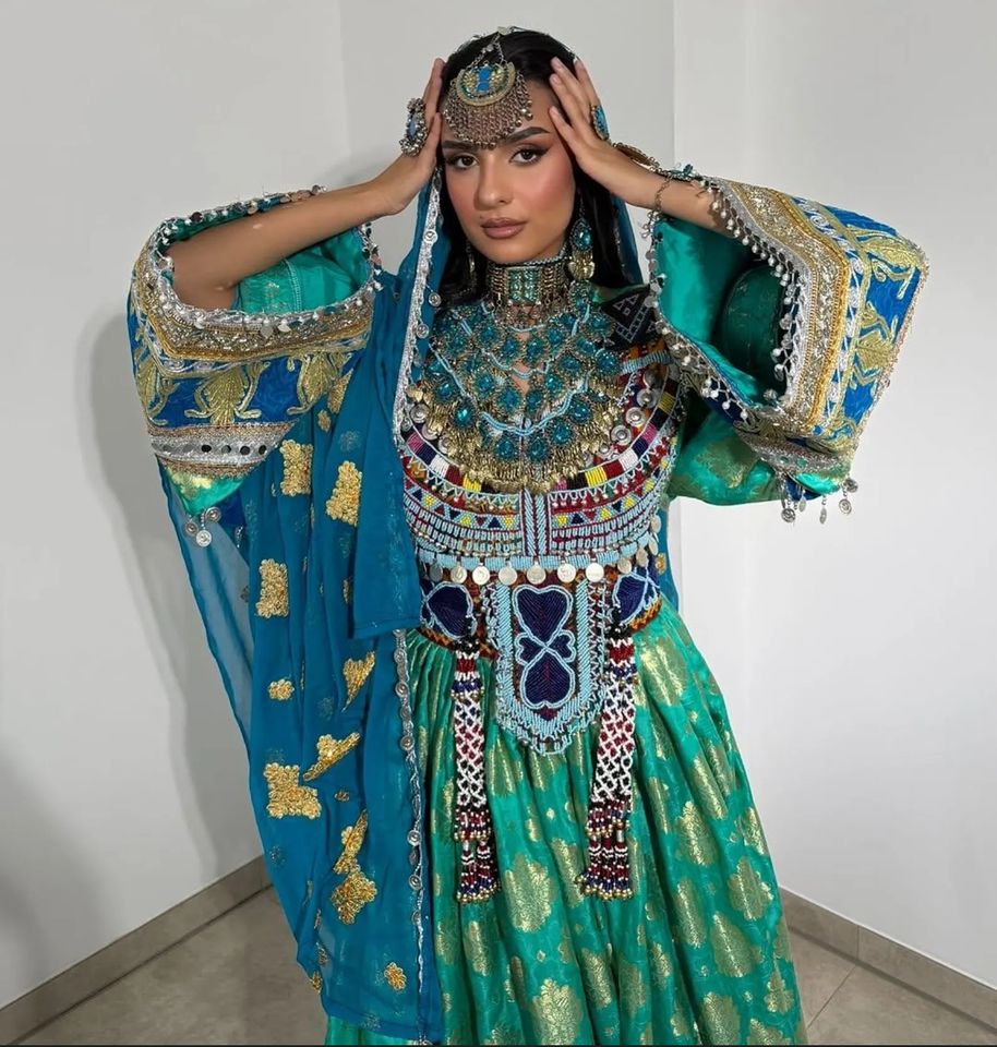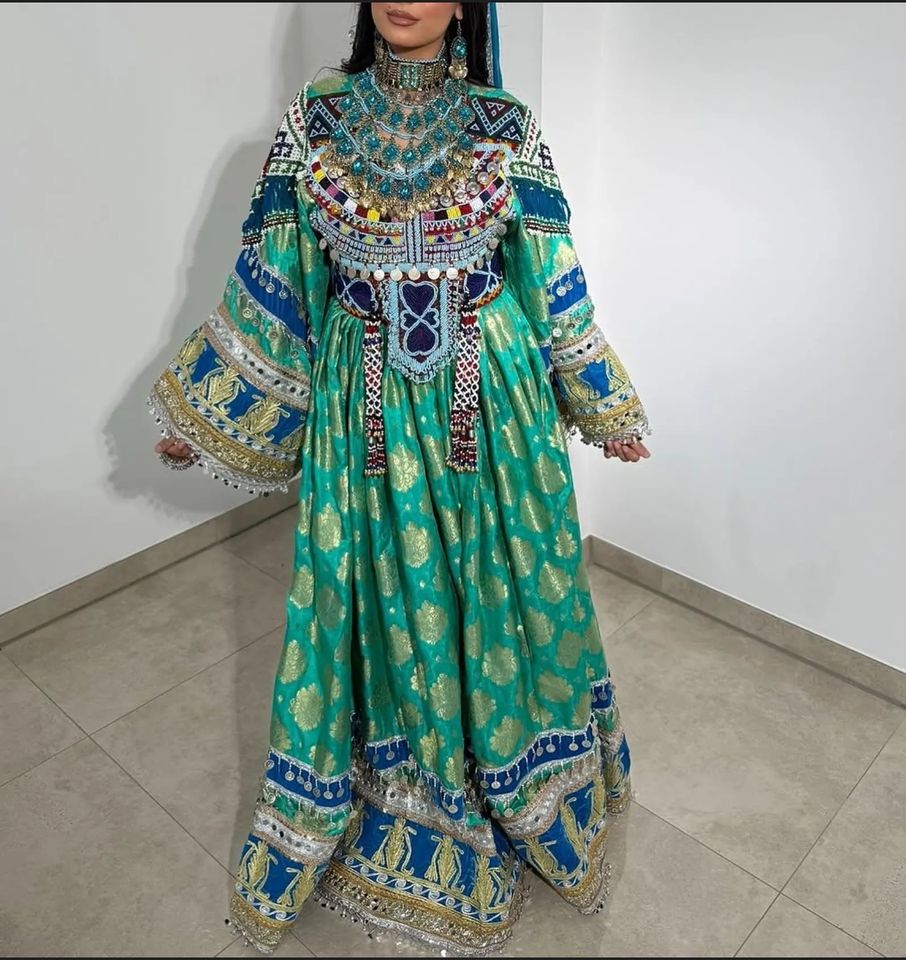 Handmade Traditional Kuchi Afghan Gown Gold Brocade Heavy Mirror Beaded Embroidery Turquoise Dress Lace Button Natural