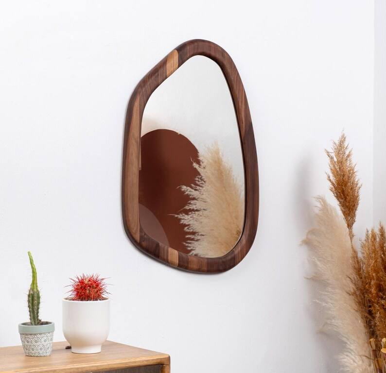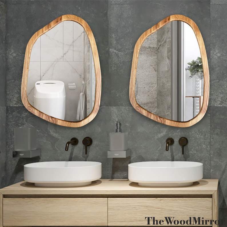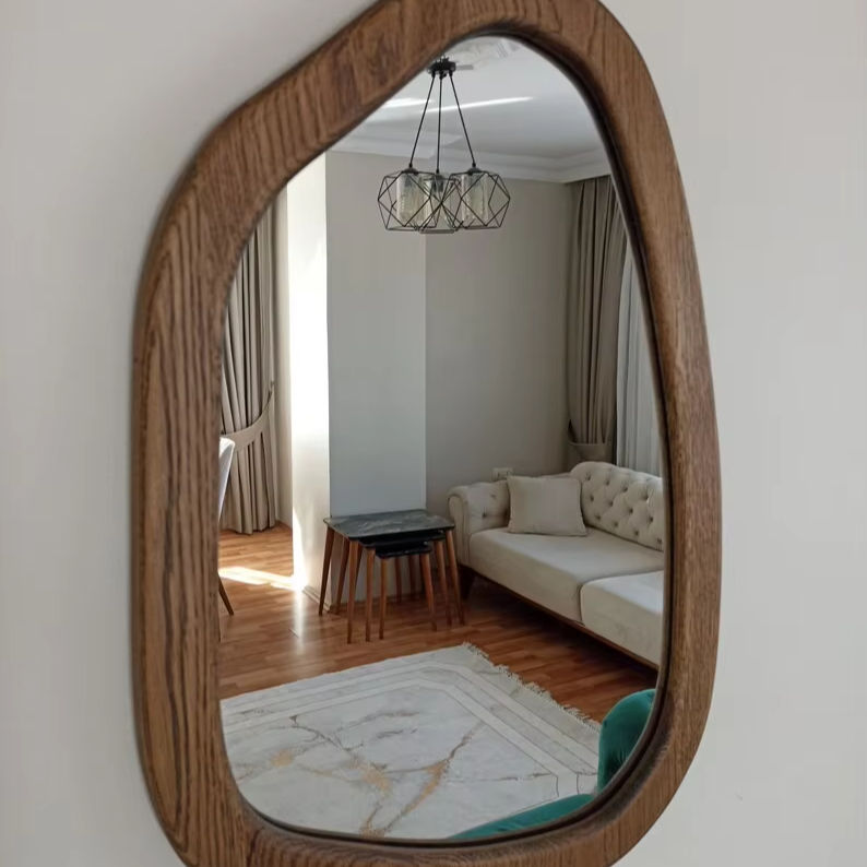 Handmade Asymmetrical Art Deco Design Wooden Wall Mirror Elegant Homeowners Featuring Oak Walnut Wood for Bathroom or Home Use