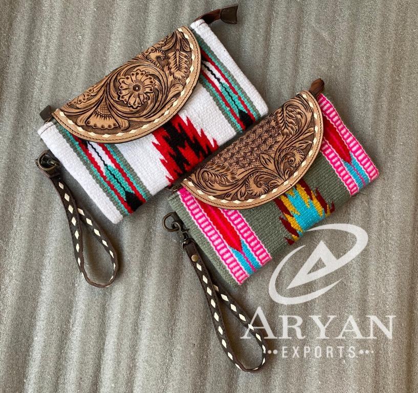 Handmade Aztec Tooled Leather Clutch Stylish Women Saddle Blanket Leather Wallets High Quality Tooled Leather Wristlet Clutch