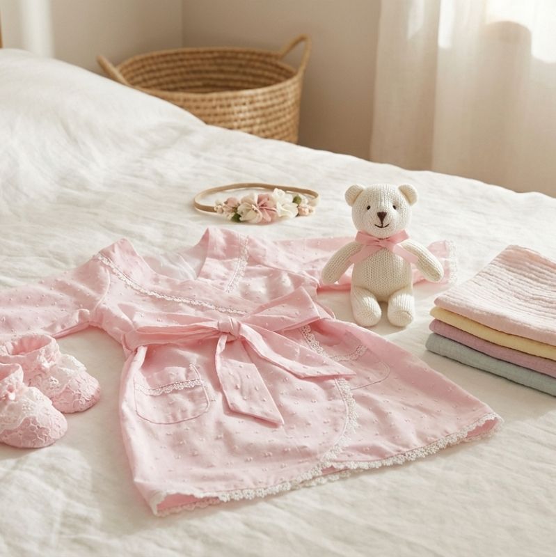 Handmade Baby Girl Nightgown Robe, Pink Cotton Dobby Fabric with Lace Details and Tie Waist, Boutique Infant Sleepwear Clothing