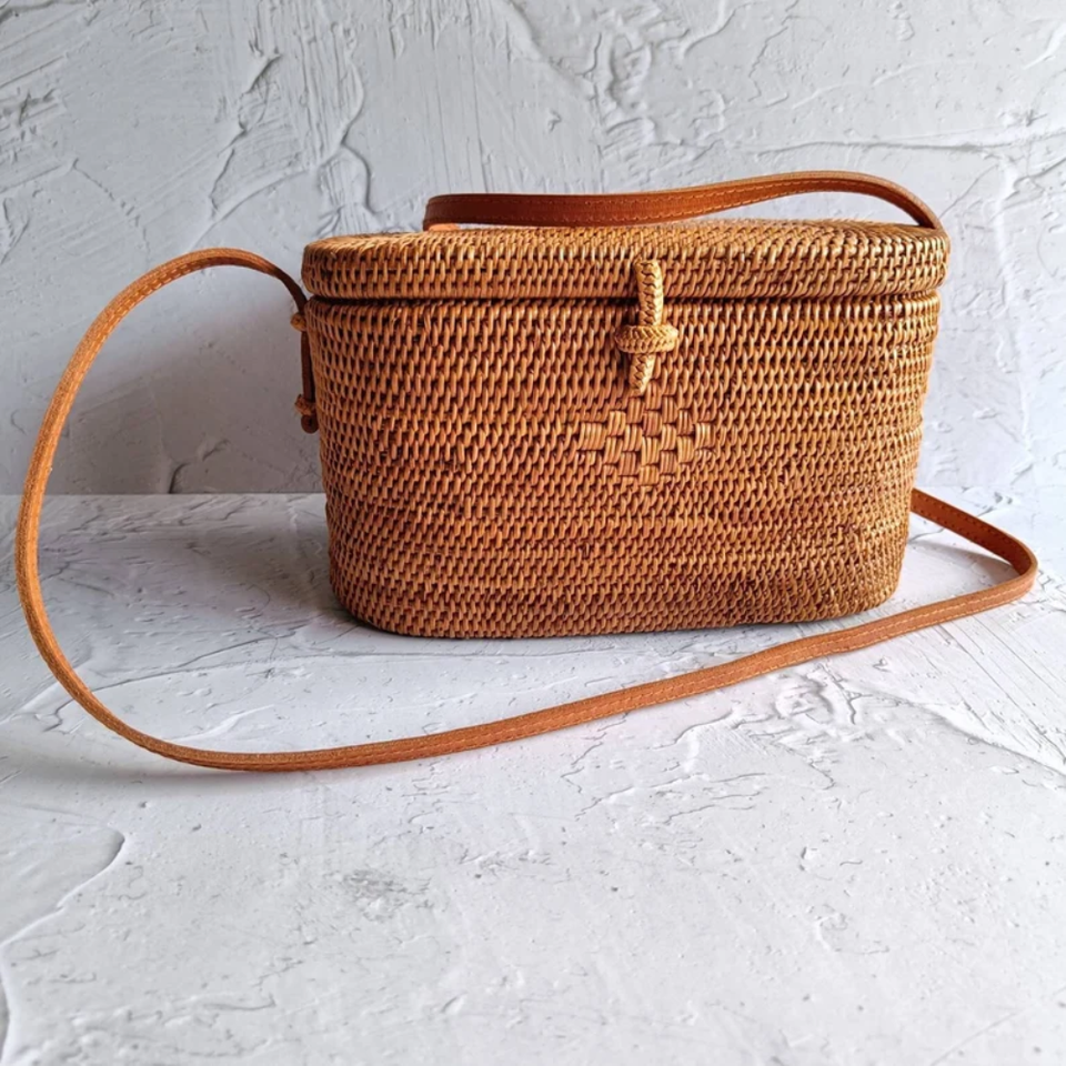 Handmade Bali Oval Rattan Bag With Leather Strap Ata Bag Straw Woven Bag Bohemian Crossbody Bag
