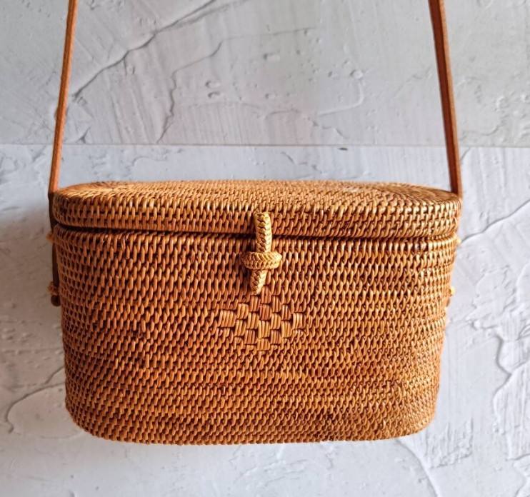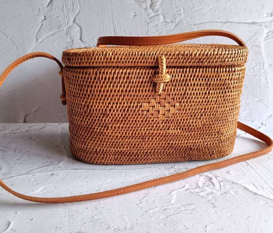 Handmade Bali Oval Rattan Bag With Leather Strap Straw Woven Bag Bohemian Crossbody Bag