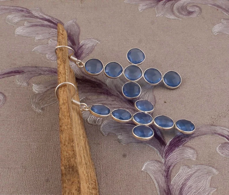 Handmade Sterling Silver Cross Sign Earring Beautiful Blue Aqua Gemstone for Women's Wedding Party or Gift