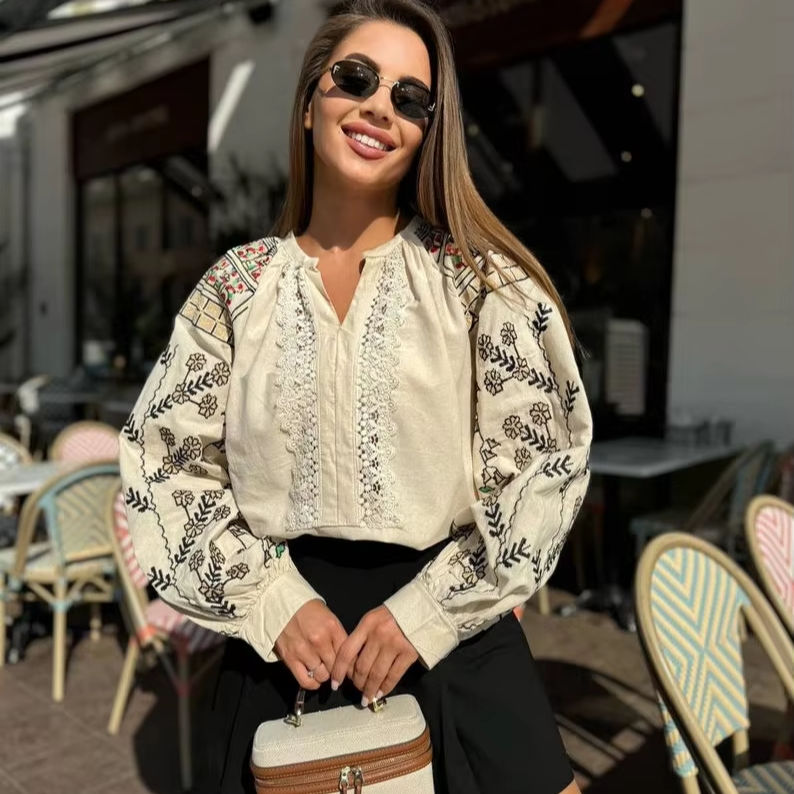 Handmade Beige Vyshyvanka Blouse for Women Ukraine Etno Floral Embroidered Shirt with Natural Waistline Heritage Fashion Gifting