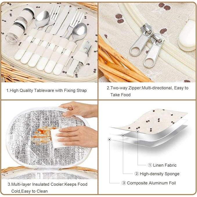 Handmade Beige Willow Basket Insulated Cooler Bag Great Picnic Basket for 2 with Wine Table Wedding Birthday Gift