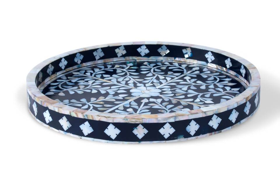 Handmade Black Resin Serving Tray Traditional Round Mother of Pearl Inlay Decorative Home Hotel Office Restaurant Bars Low Price