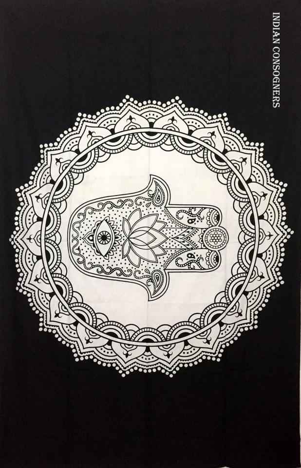 Handmade Black White Cotton Humsa Tapestry Beautiful Printed Twin Size Bedspread Wall Hanging Home Decor By Indian Consigners