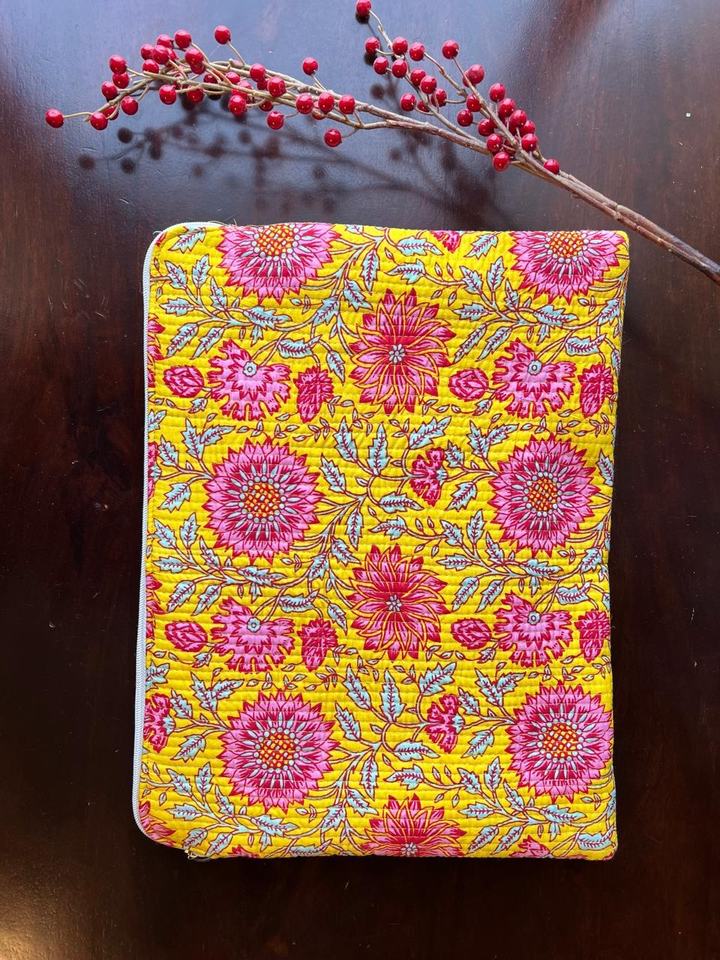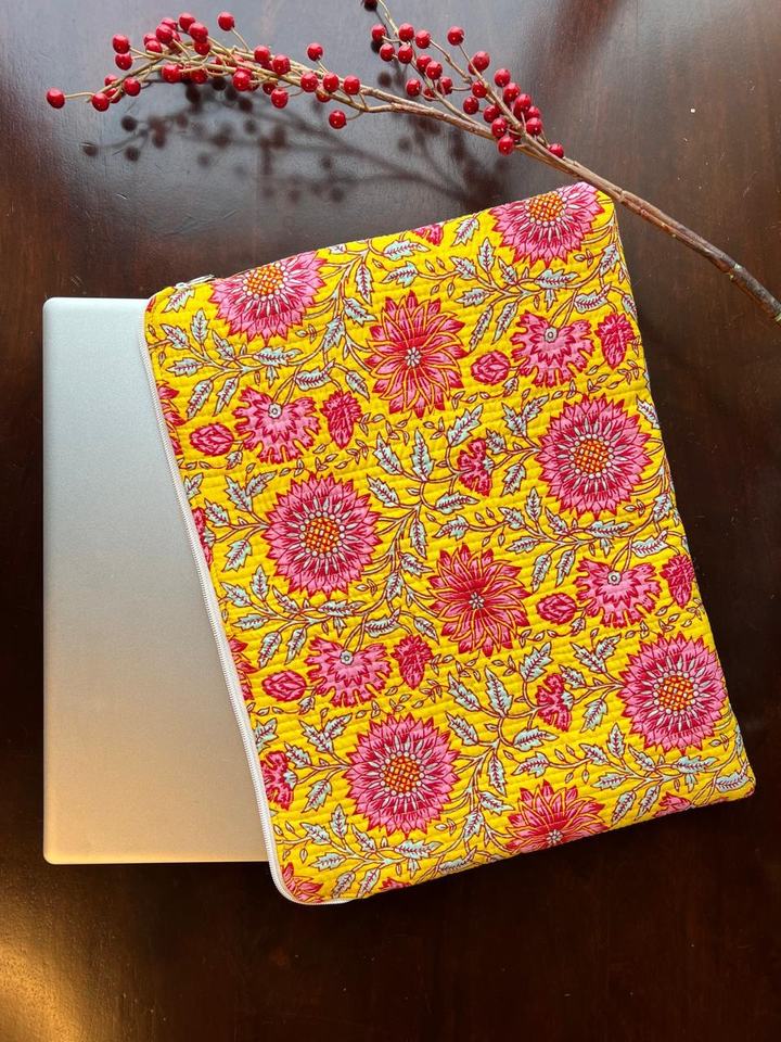 Handmade Block Print Quilted Durable Modern Laptop Sleeve Yellow Floral Cotton 15 Inch Waterproof Laptop Bags