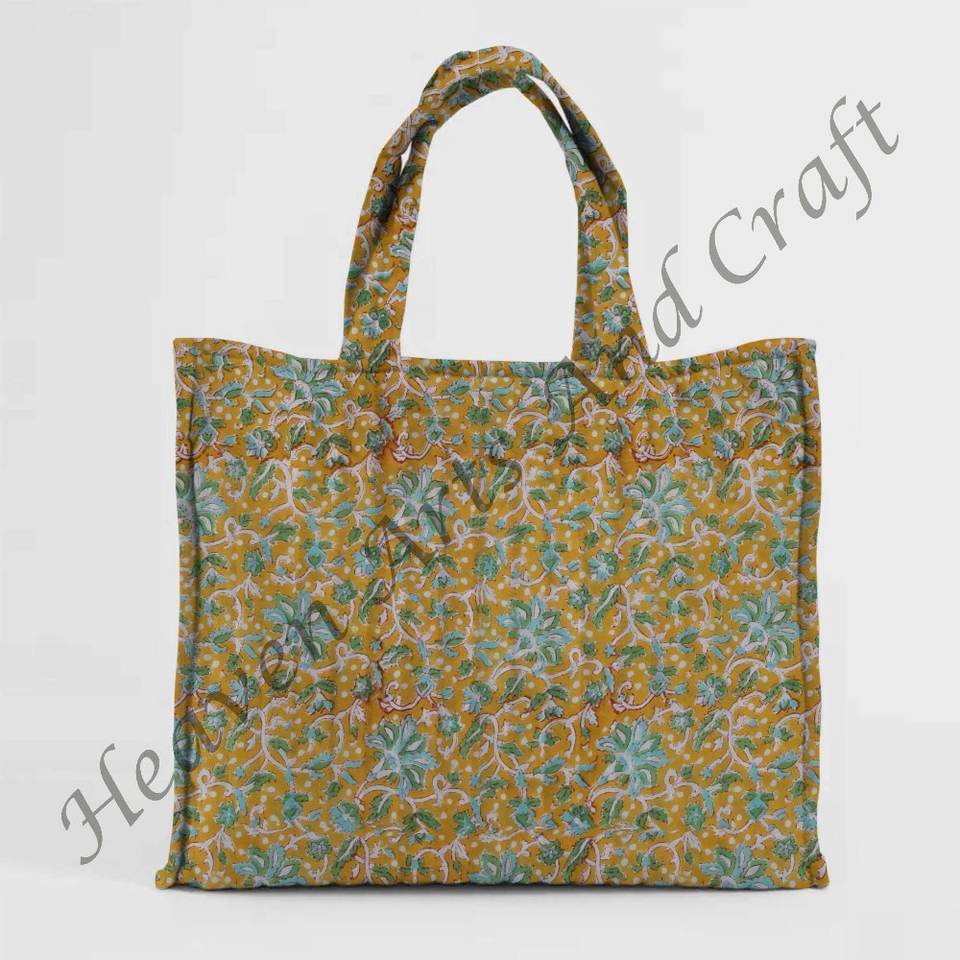 Handmade Block Print Quilted Tote Bag Eco-Friendly Floral Cotton Quilted Square Lightweight With Handy Pocket For Summer Winter