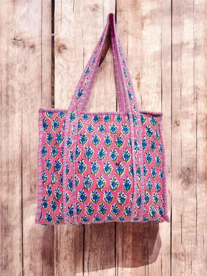 Handmade Block Printed Cotton Bag with Vibrant Pink Base Blue Floral Patterns Striped Trims Medium Weight Activewear Easy Wash