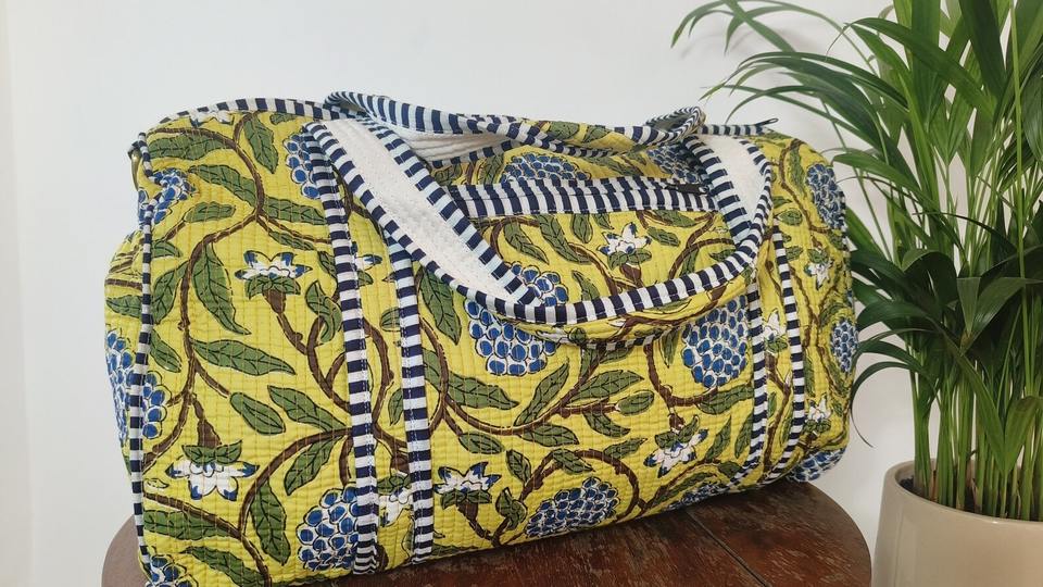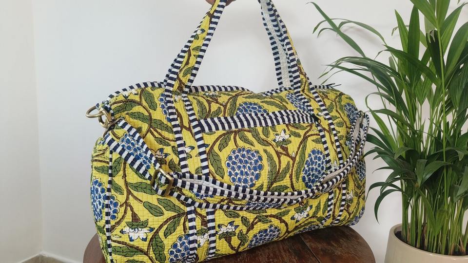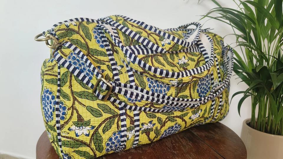 Handmade Block Printed Cotton Case Detachable Belt Vintage Style Zipper Closure Yoga Gym Travel Eco-Friendly Water Resistant