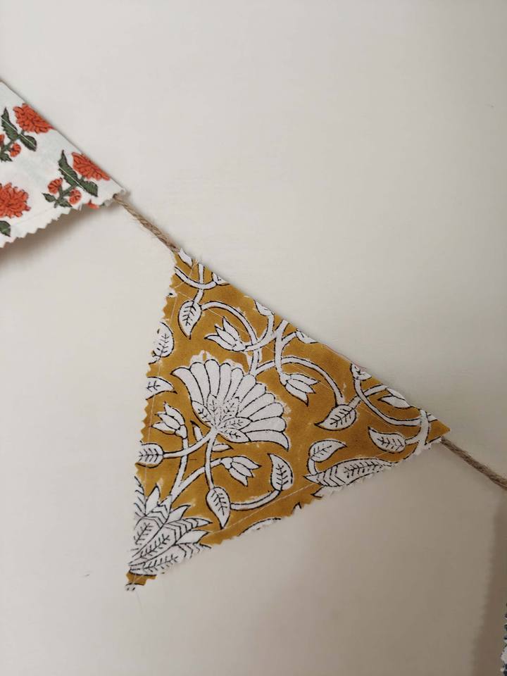 Handmade Block Printed Fabric Bunting Flags for Weddings Baby Showers Festivals Diwali Colorful Recycled Banner Wall Decor