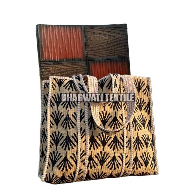 Handmade Indian Cotton Tote Bag with Dual Handles Block Printed Quilted Design Stylish Women's Shoulder Bag with Logo