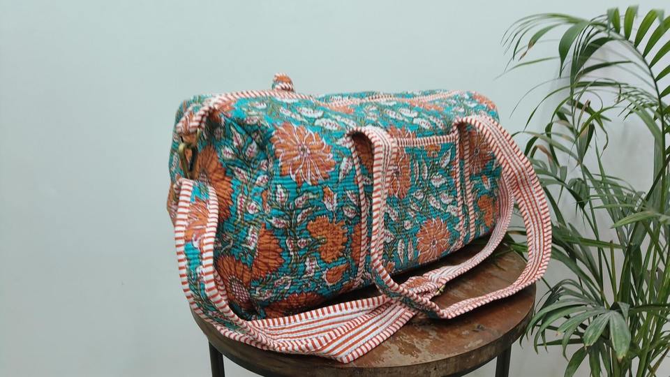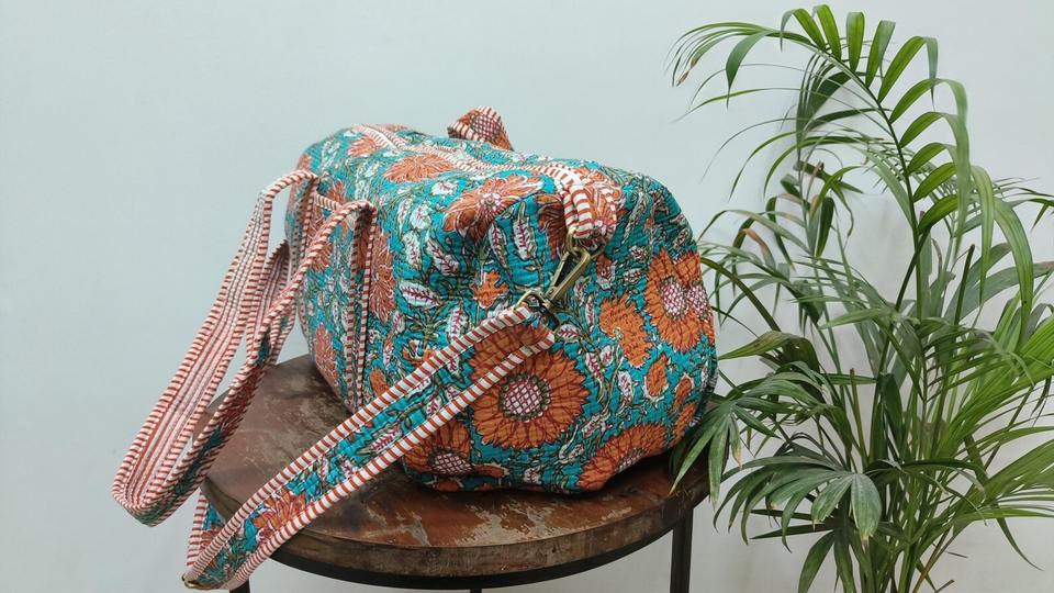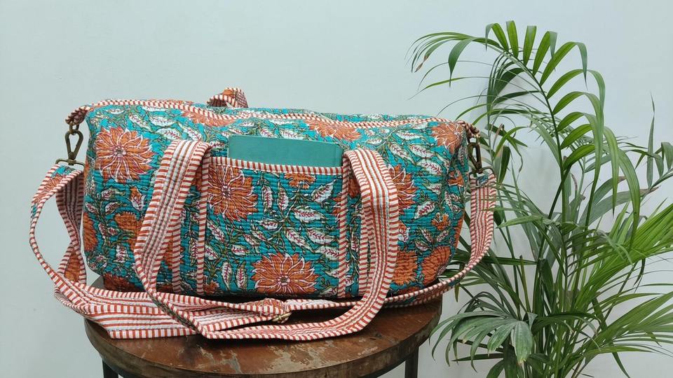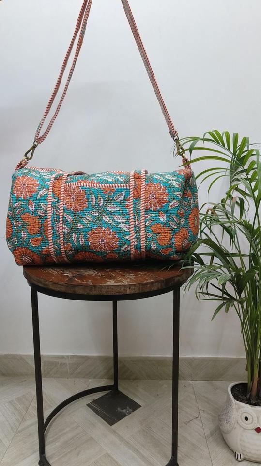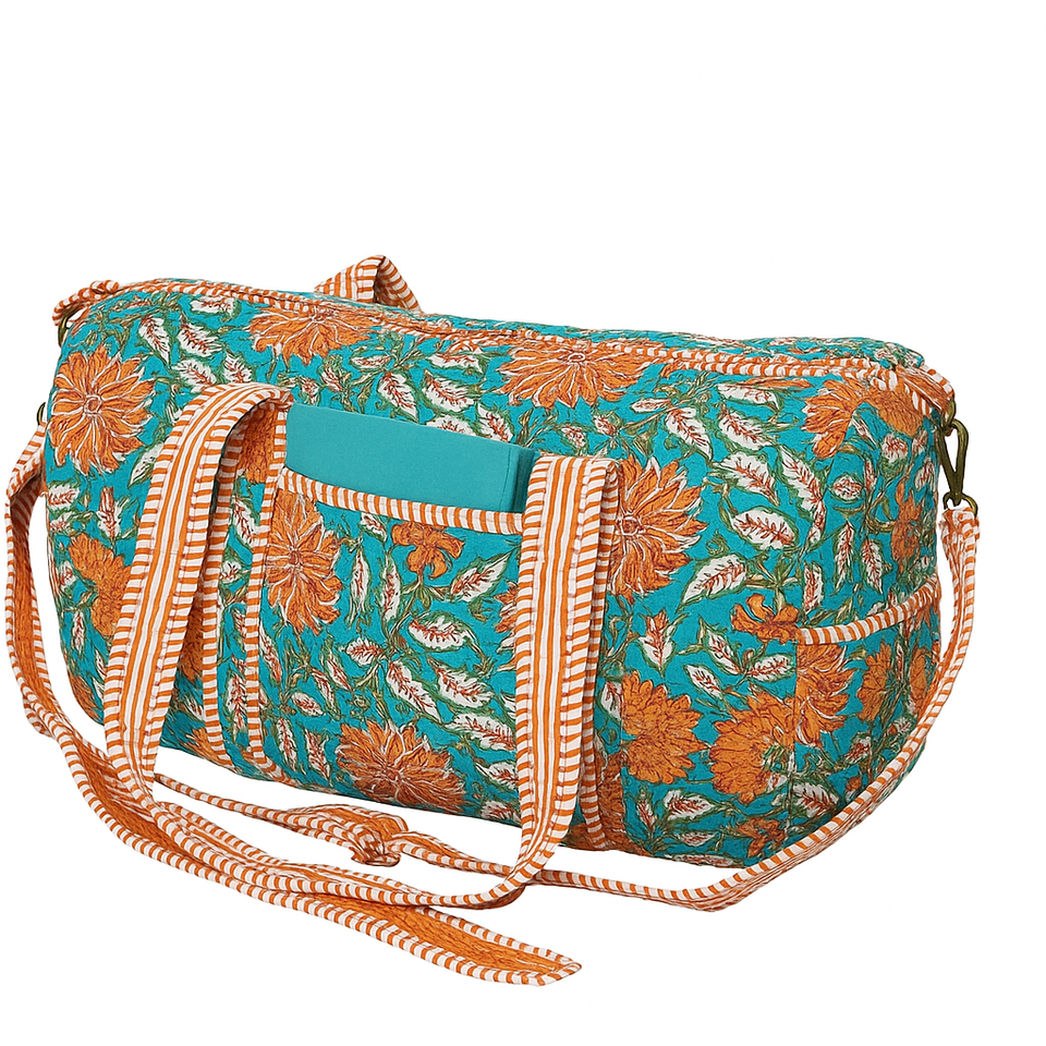 Handmade Blockprinted Quilted Cotton Duffle Bag Detachable Long Belt Durable Sport Yoga Shoulder Bag-Sea Green Luxury Weekender