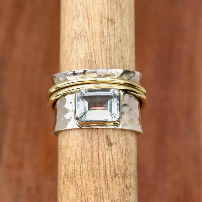 Handmade Blue Topaz Spinner Ring in 925 Sterling Silver Two Tone Wide Band Fidget Meditation Ring for Women Thumb Ring