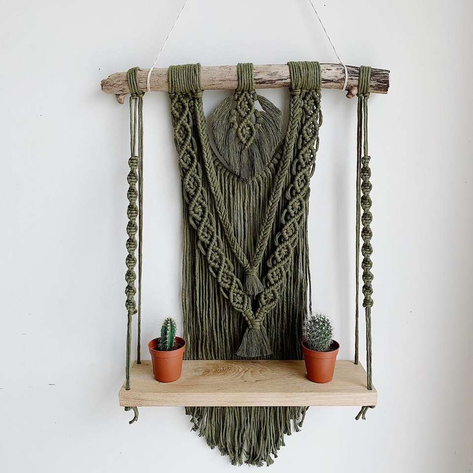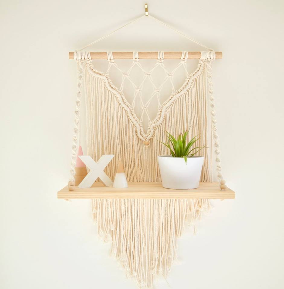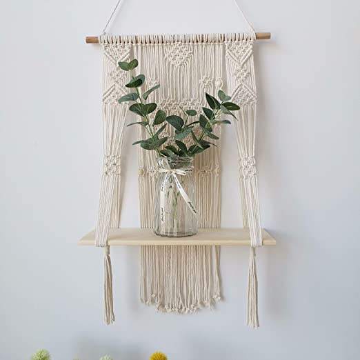 Handmade Bohemian Cotton Macrame Wall Hanging Indoor Decorative Wooden Shelf with Plant Flower Hanger Pot Holder