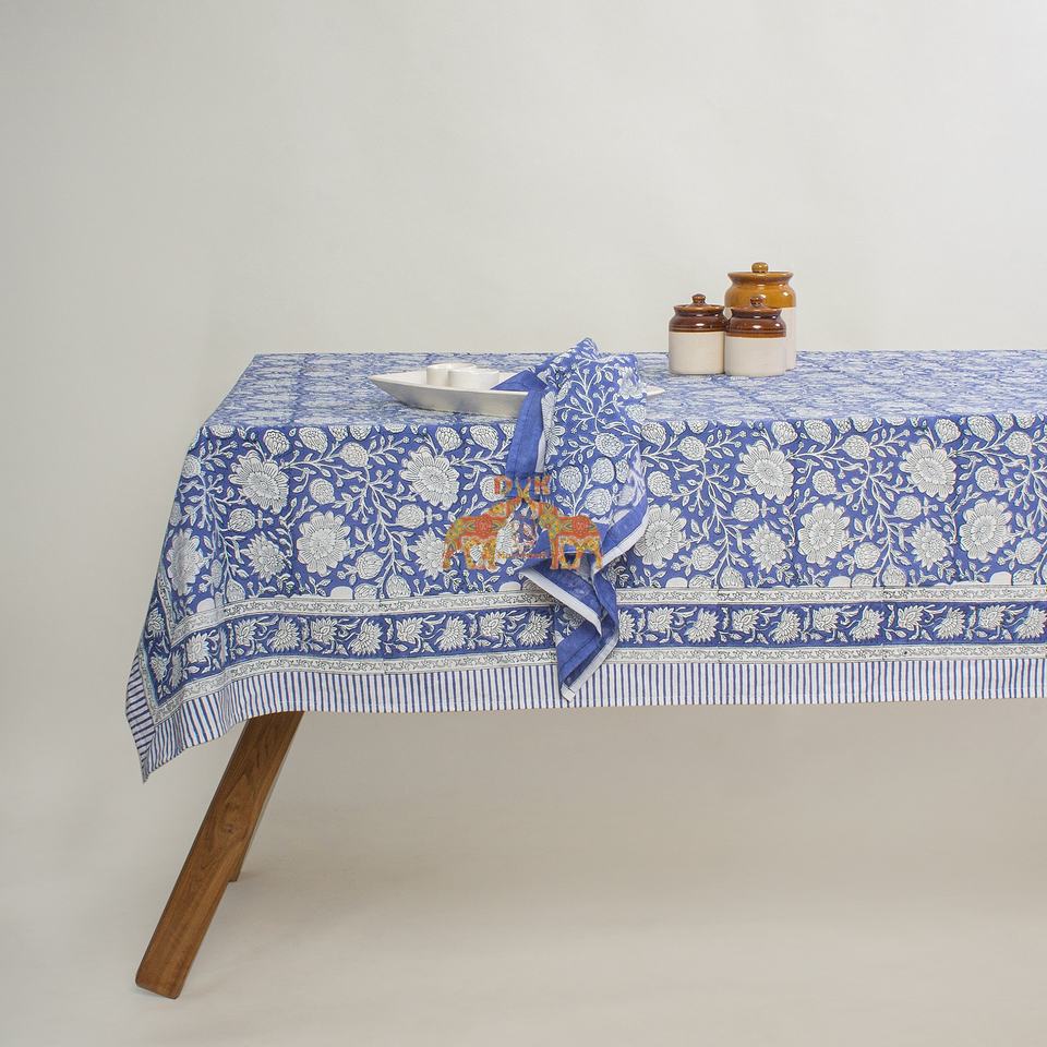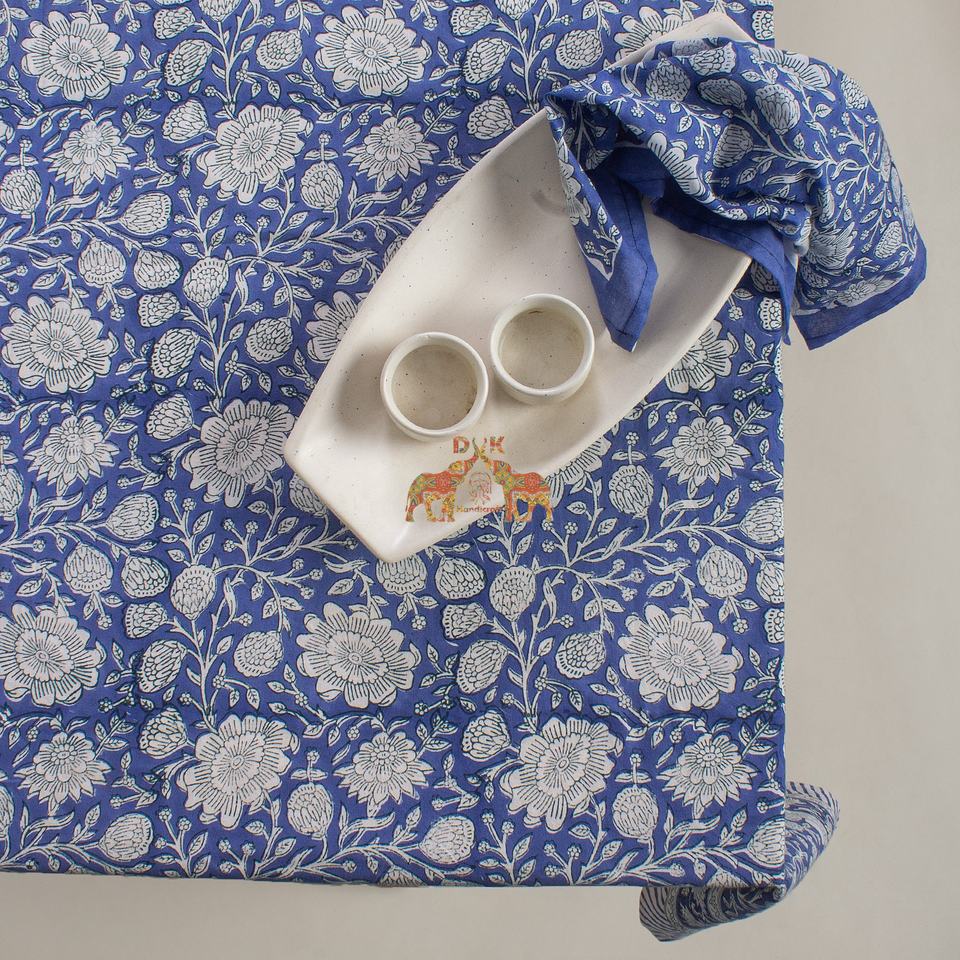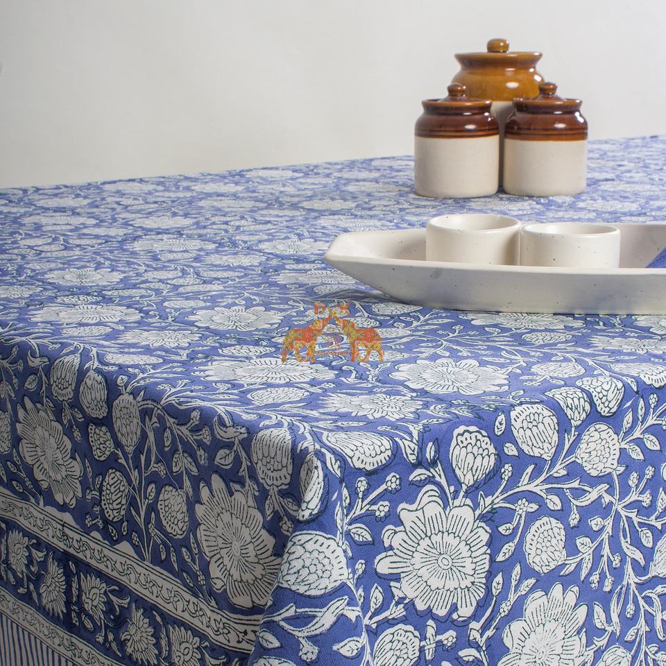 Handmade Bohemian Style Blue Floral Embroidered Cotton Table Cover Hand Block Print for Hotel and Banquet Use