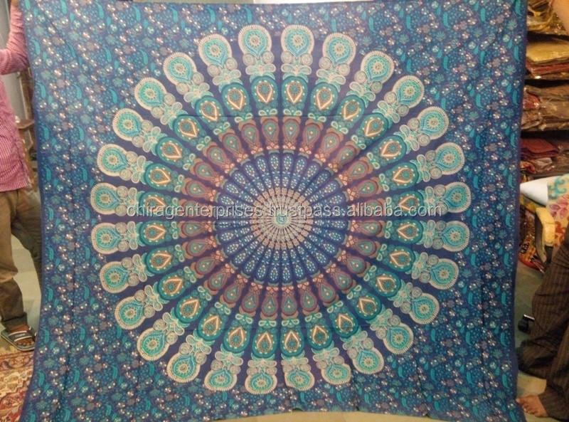 Handmade Bohemian Style Cotton Bedspread Blue White Floral Mandala Tapestry Design Hippie Wall Hanging for Home Use Beach Towel