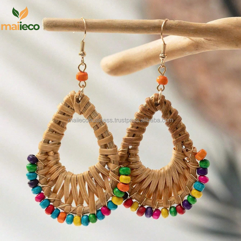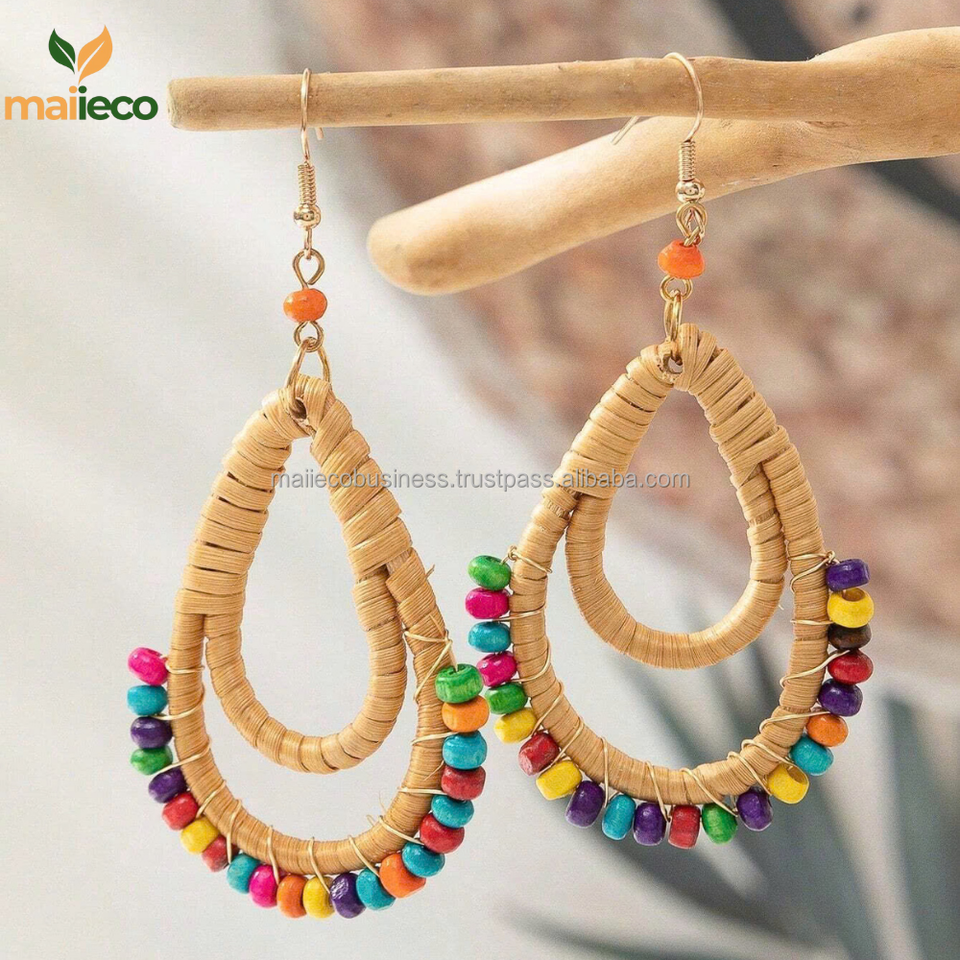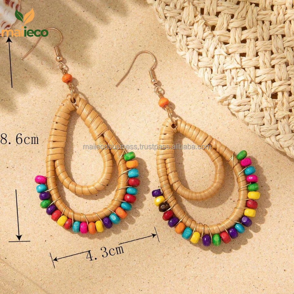 Handmade Bohemian Vintage Tassel Rattan Earrings Colorful Round Beads Stud with Charm Fashionable Hoop Jewelry