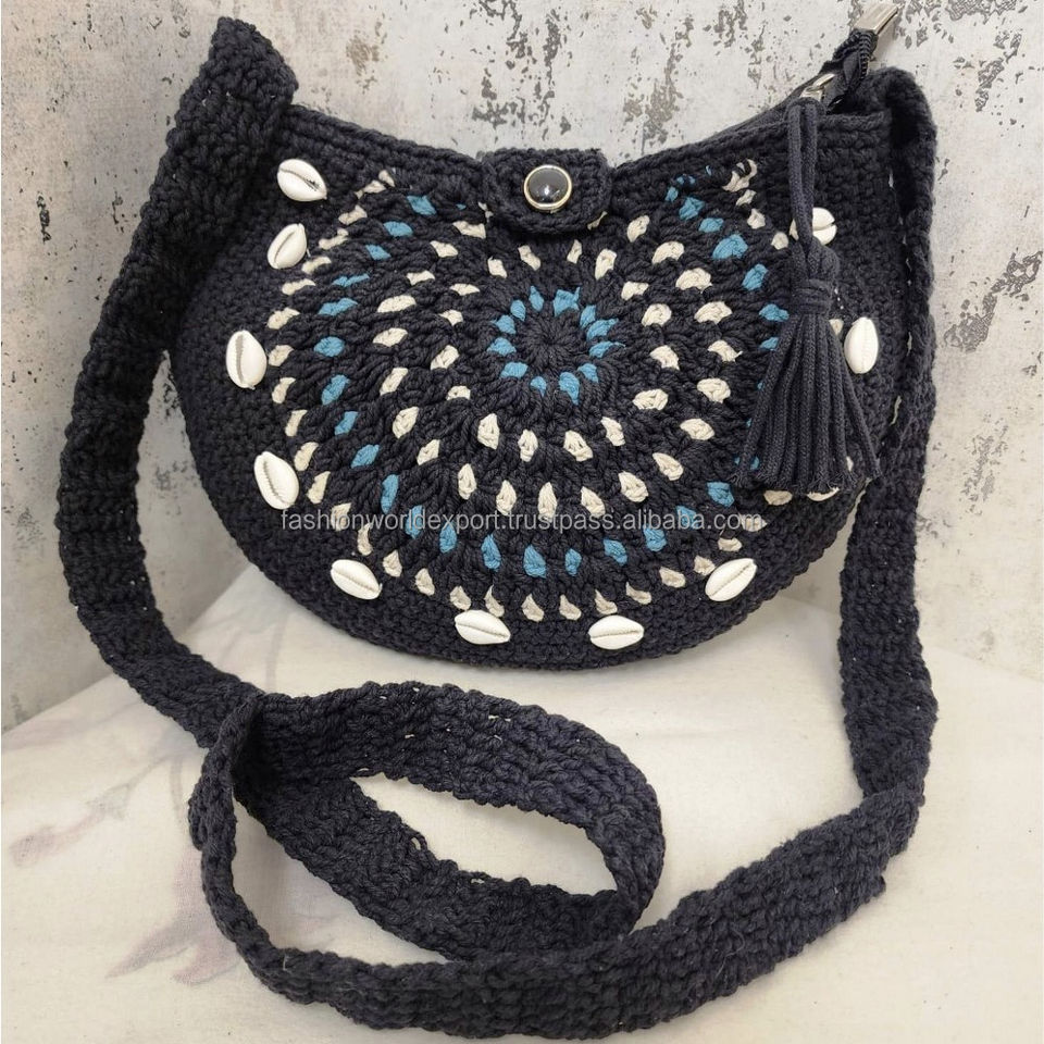 Handmade Boho Crochet Shoulder Bag with Cowrie Shell Accents Tassel Detail and Button Closure Brown White & Blue Mandala Design