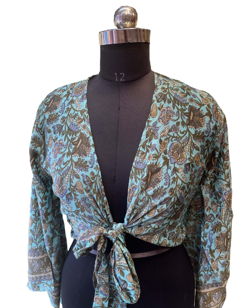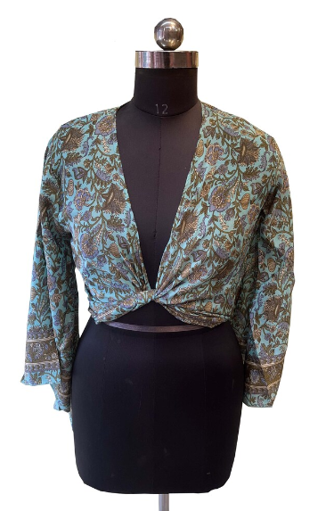 Handmade Boho Hippie Style Vintage Silk Sari Modest Summer Short Wrap Top with Front Tie and Bell Sleeves