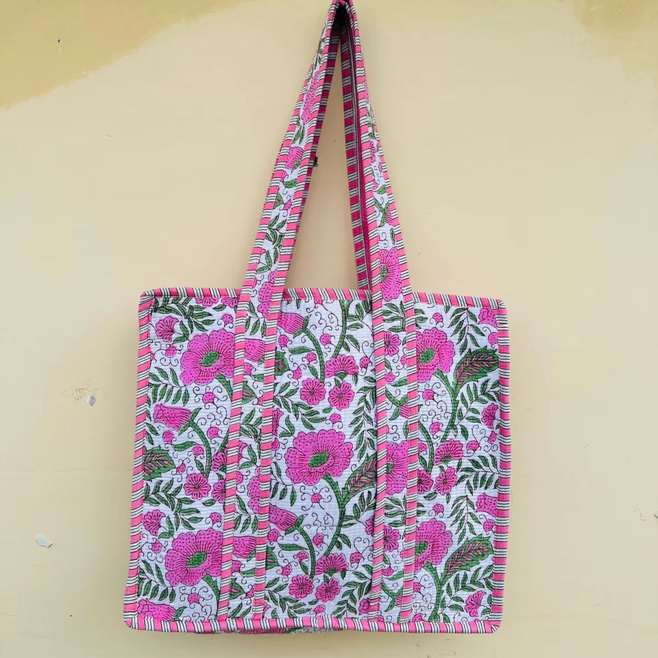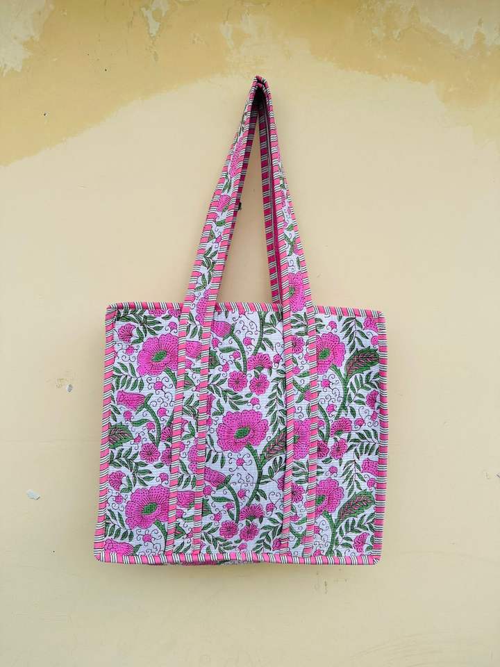 Handmade Boho Quilted Cotton Tote Bag Floral Block Print Duffle Bag Eco-friendly Sustainable Reversible Large Shopping Bags