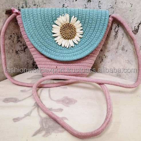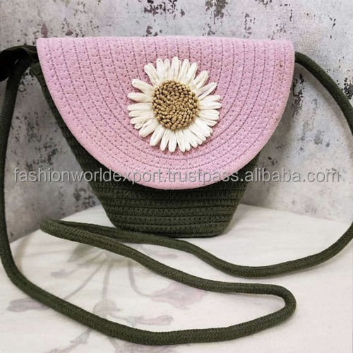 Handmade Boho turquoise Crossbody Bag with Crochet Daisy Applique Woven Rope Strap Shoulder Purse with Tan Flap & Floral Accent
