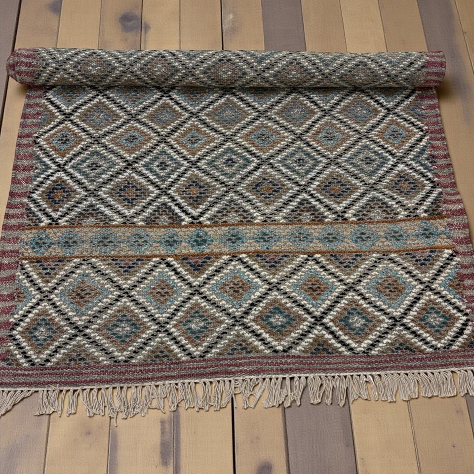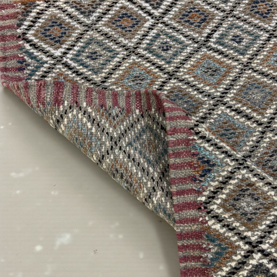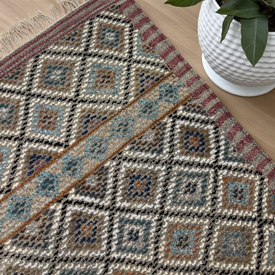 Handmade Modern Abstract Eco-Friendly Kilim Rug-Tan & Navy Blue Flatweave Hand-Woven Wool with Earth-Tone Vine Leaf Motifs
