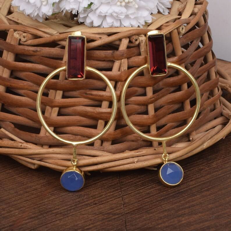 Handmade Brass Blue Chalcedony and Red Garnet 68mm Fashion Chandelier Hoop Earrings
